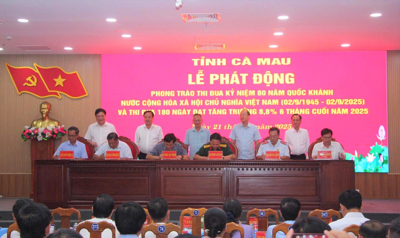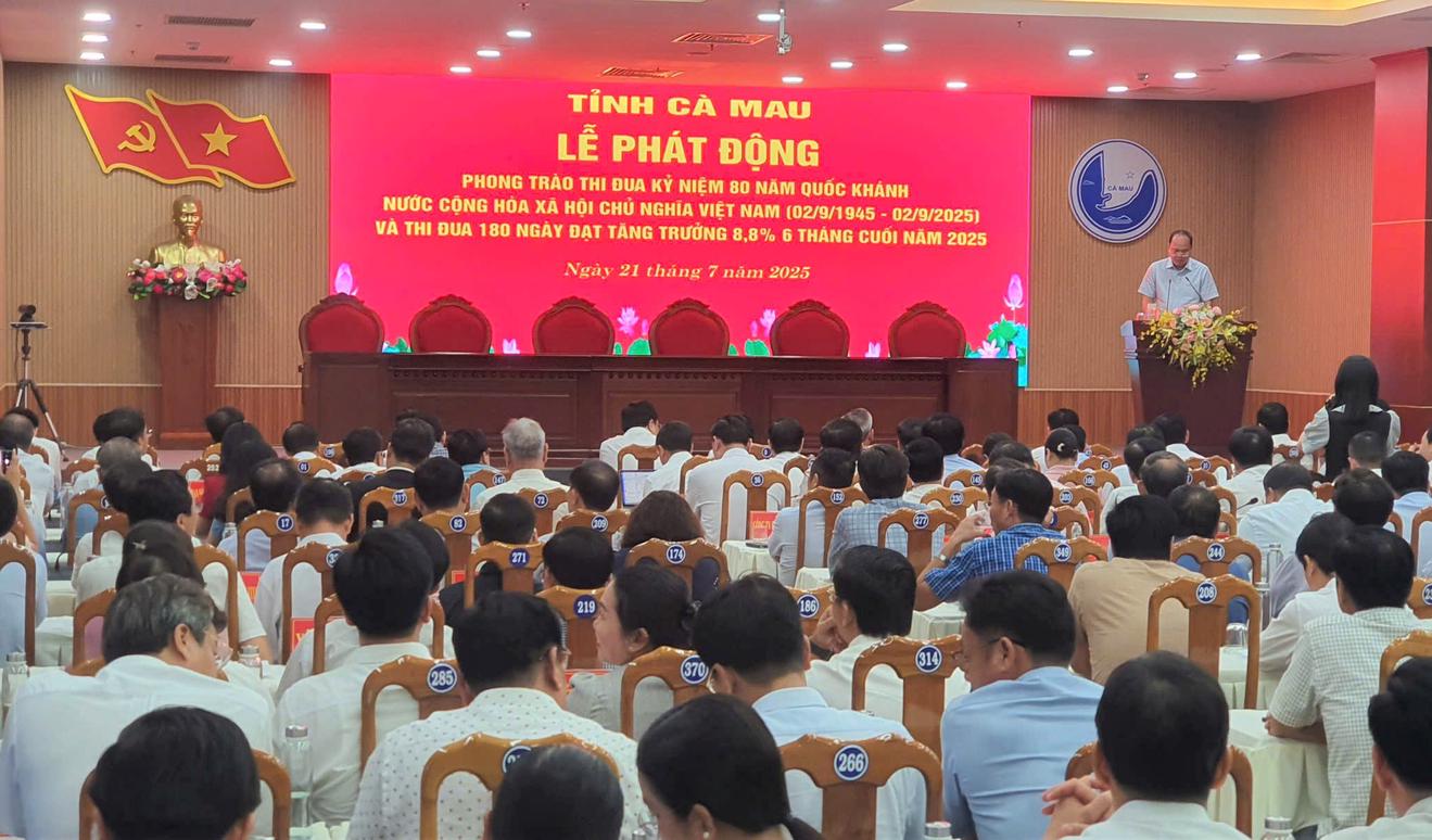 (Thanh tra) - Chiều ngày 21/7/2025, UBND tỉnh Cà Mau đã tổ chức Lễ phát động Phong trào thi đua Kỷ niệm 80 năm Quốc khánh nước Cộng hòa xã hội chủ nghĩa Việt Nam (2/9/1945-2/9/2025) và thi đua 180 ngày đạt tăng trưởng 8,8% 6 tháng cuối năm 2025. Tham dự buổi lễ có lãnh đạo Tỉnh ủy, HĐND tỉnh, UBND tỉnh, đại diện Ủy ban MTTQVN tỉnh và các sở, ban, ngành của tỉnh Cà Mau.