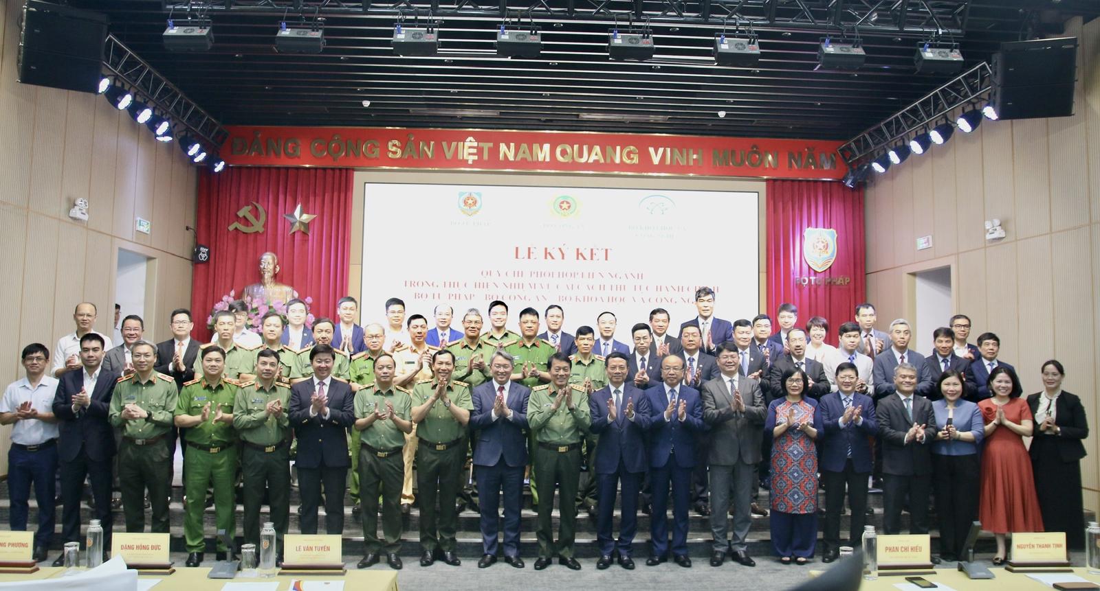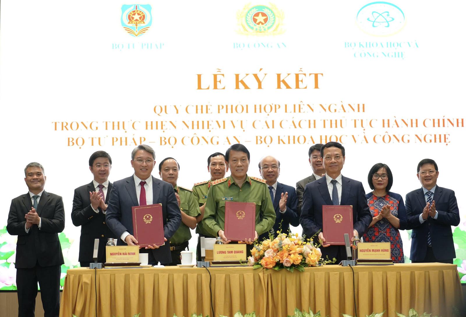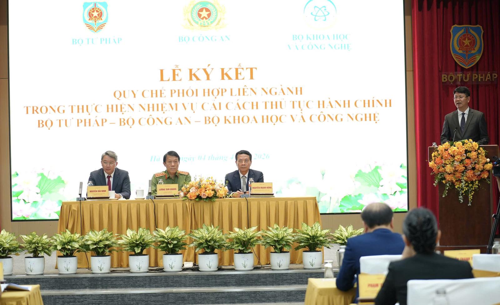 Ủy viên Bộ Chính trị, Đại tướng Lương Tam Quang, Bộ trưởng Bộ Công an; Ủy viên Trung ương Đảng, Bộ trưởng Bộ Tư pháp Nguyễn Hải Ninh; Bộ trưởng Bộ Khoa học và Công nghệ Nguyễn Mạnh Hùng đồng chủ trì lễ ký kết, với sự tham dự của các thứ trưởng ba bộ, đại diện các bộ, ngành, cơ quan, đơn vị, doanh nghiệp đồng hành…
