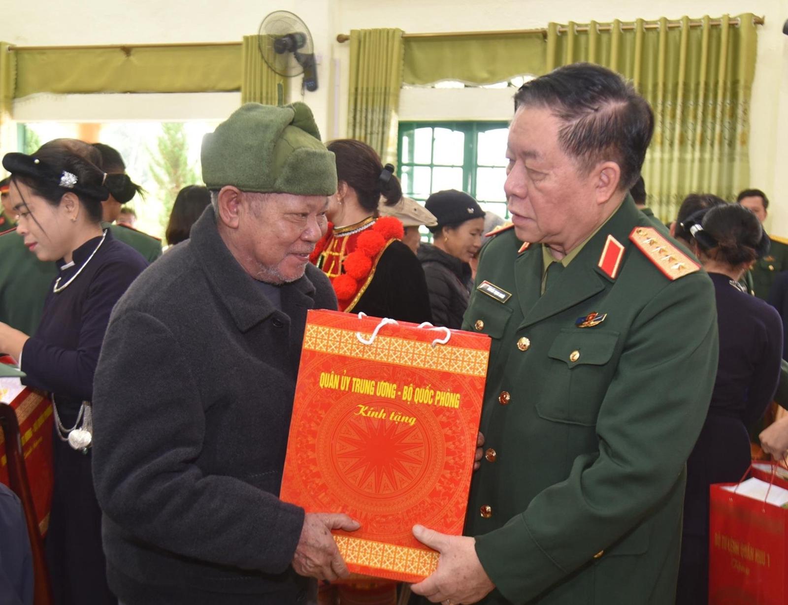 Đại tướng Nguyễn Trọng Nghĩa, Chủ nhiệm Tổng cục Chính trị QĐND Việt Nam tặng quà gia đình chính sách tại xã Tam Kim. Ảnh: Hà-Tiệp-Luân