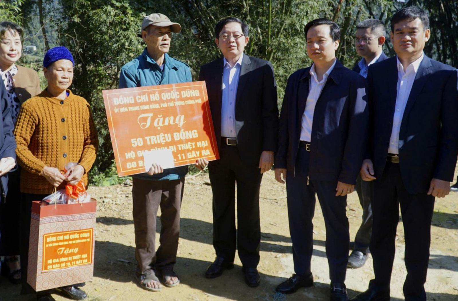 Phó Thủ tướng Chính phủ Hồ Quốc Dũng trao tặng kinh phí hỗ trợ khắc phục hậu quả thiên tai cho gia đình ông Nông Quốc Toàn. Ảnh: Nguyệt Hà - Tiến Dũng