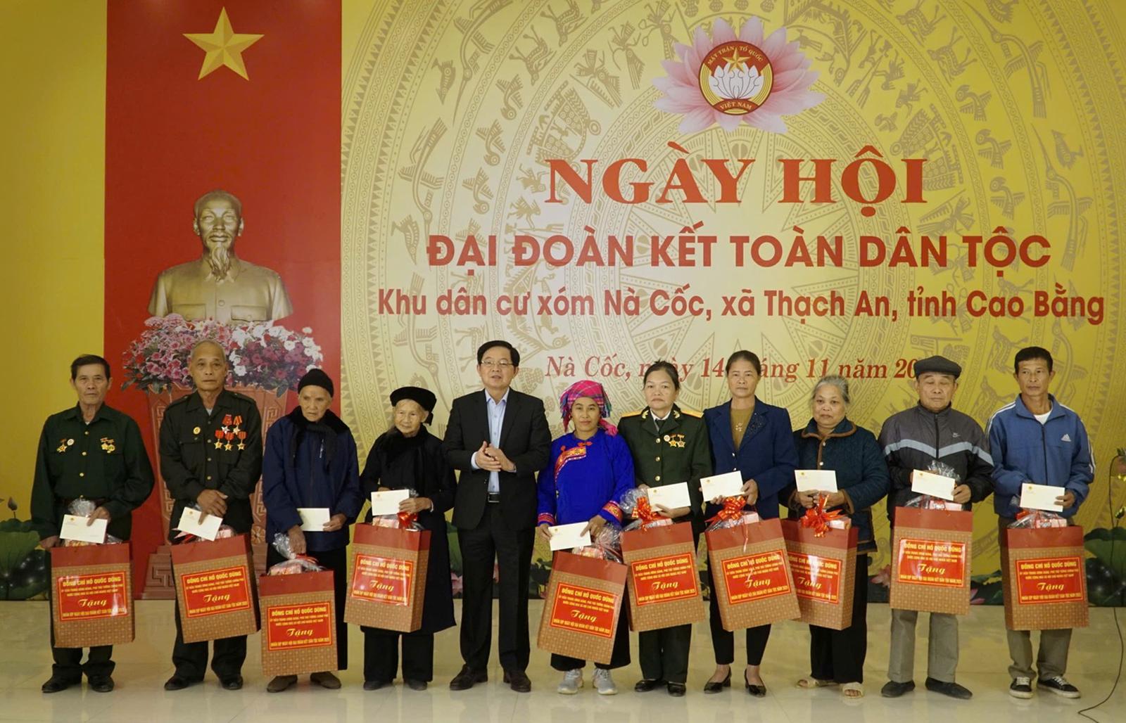Nhân dịp này, Phó Thủ tướng Hồ Quốc Dũng tặng quà cho khu dân cư và và 10 hộ dân tiêu biểu trong Phong trào “Toàn dân đoàn kết xây dựng đời sống văn hóa”. Lãnh đạo tỉnh tặng quà cho 23 hộ nghèo, cận nghèo, gia đình chính sách khu dân cư xóm Nà Cốc, xã Thạch An.