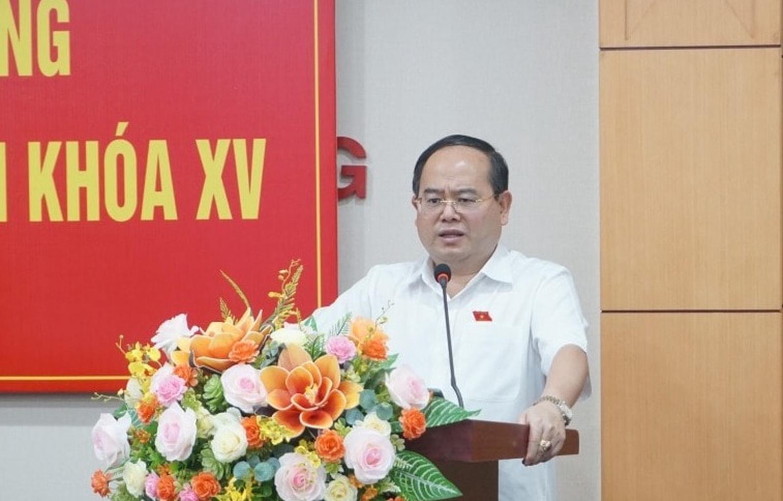 Bí thư Tỉnh uỷ, Trường Đoàn đại biểu quốc hội tỉnh Cao Bằng Quản Minh Cường phát biểu tại buổi tiếp xúc cử tri sau Kỳ họp thứ 9. Ảnh: Báo Cao Bằng