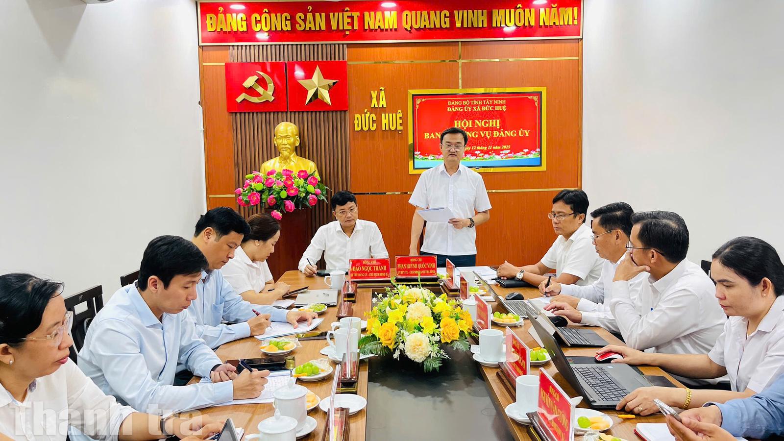 (Thanh tra) - Ngày 12/11, ông Phan Huỳnh Quốc Vinh, Ủy viên Ban Thường vụ Tỉnh ủy, Chánh Thanh tra tỉnh Tây Ninh, phụ trách Đảng bộ xã Đức Huệ, dự và chỉ đạo Hội nghị Ban Thường vụ Đảng ủy xã Đức Huệ nhằm đánh giá kết quả thực hiện Nghị quyết 10 tháng đầu năm và đề ra phương hướng, nhiệm vụ 2 tháng cuối năm 2025.