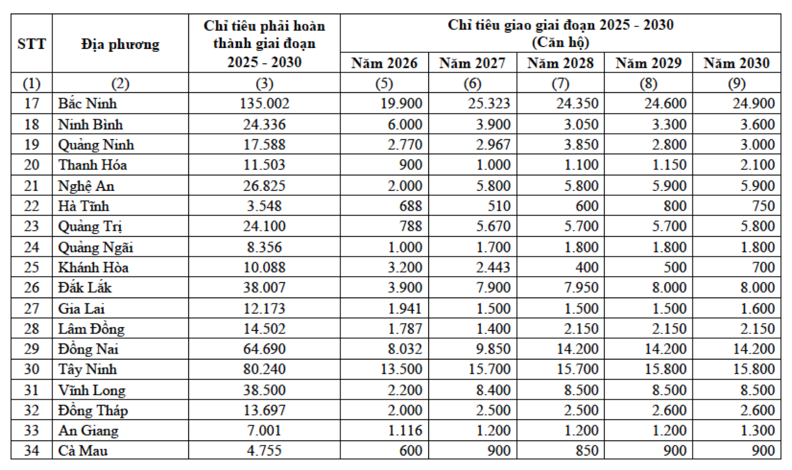 Chỉ tiêu phát triển nhà ở xã hội giai đoạn 2026 - 2030 của 34 tỉnh, thành phố