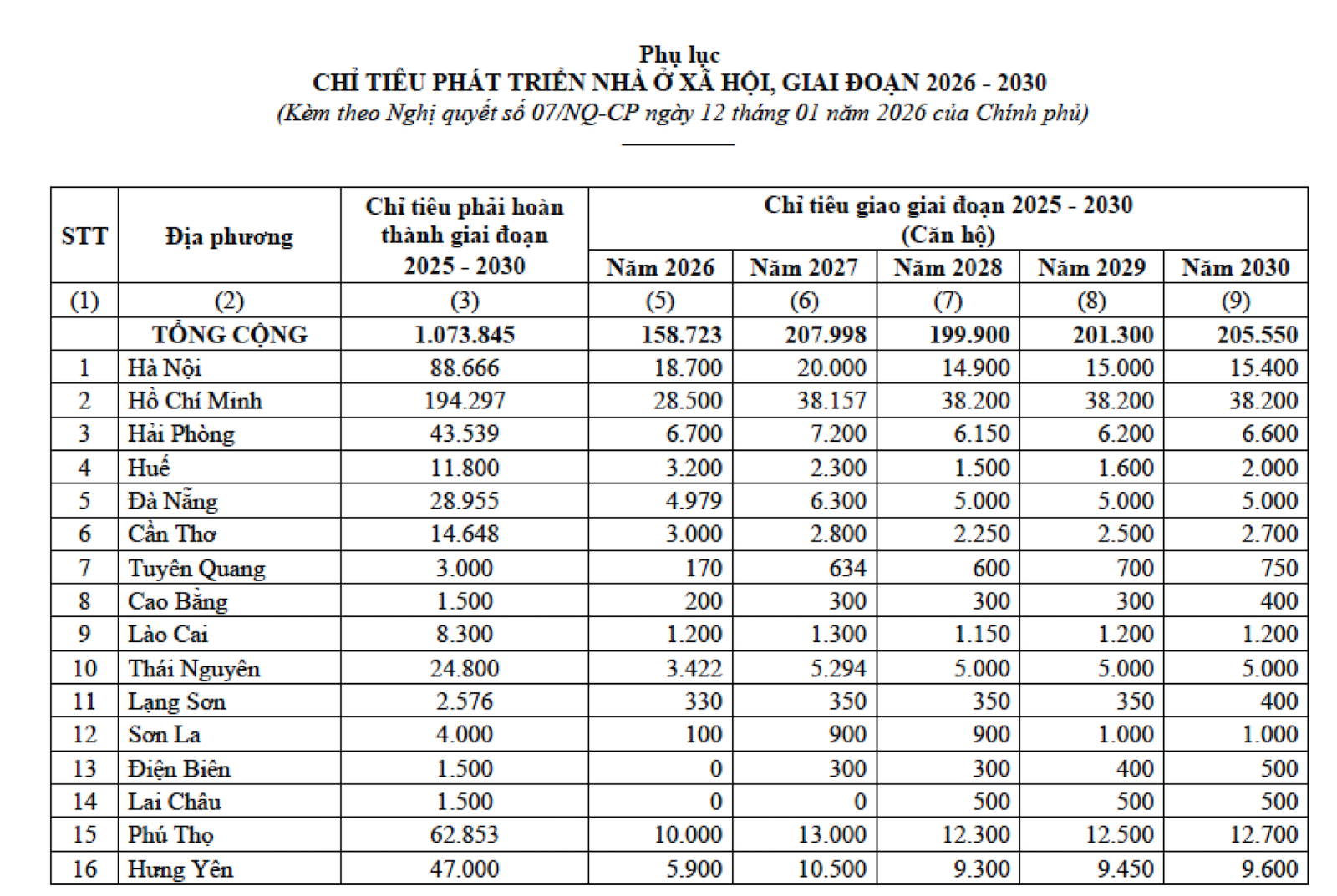 Chính phủ vừa ban hành Nghị quyết 07 về việc giao chỉ tiêu phát triển nhà ở xã hội cho các địa phương giai đoạn 2026 - 2030.