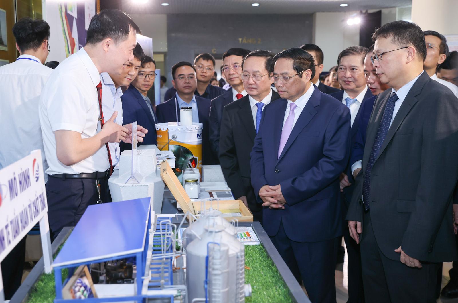 Thủ tướng Phạm Minh Chính tham quan và nghe giới thiệu Mô hình kinh tế tuần hoàn từ chất thải - một sản phẩm của Viện Hàn lâm Khoa học Công nghệ Việt Nam nghiên cứu. Ảnh: Nhật Bắc