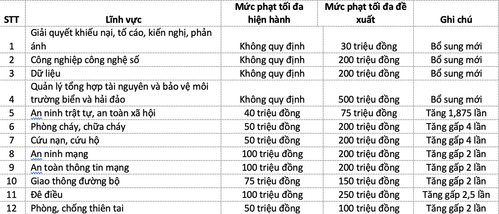 Cụ thể, Chính phủ đề xuất bổ sung xử lý vi phạm lĩnh vực giải quyết khiếu nại, tố cáo, kiến nghị, phản ánh với mức tiền phạt tối đa là 30 triệu đồng; dữ liệu, công nghiệp công nghệ số mới mức tiền phạt tối đa là 200 triệu đồng.