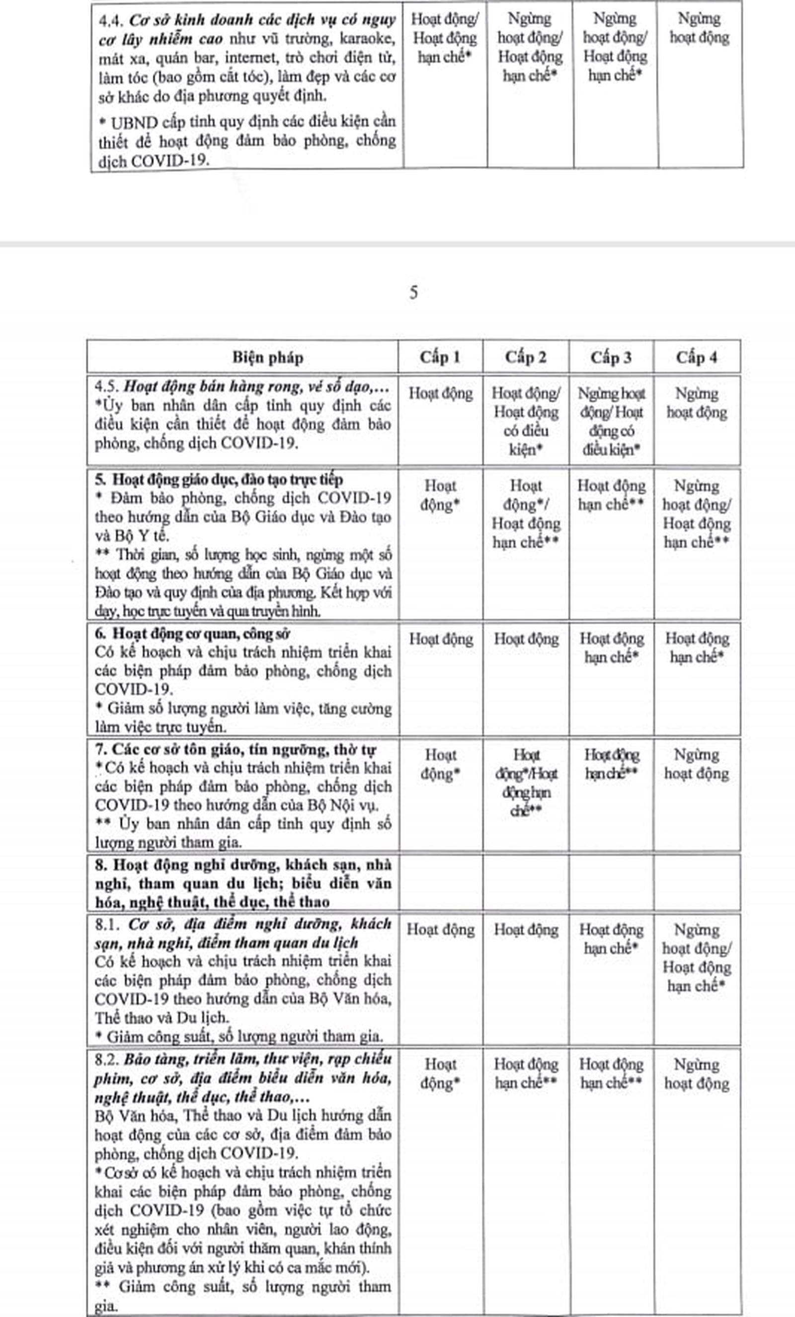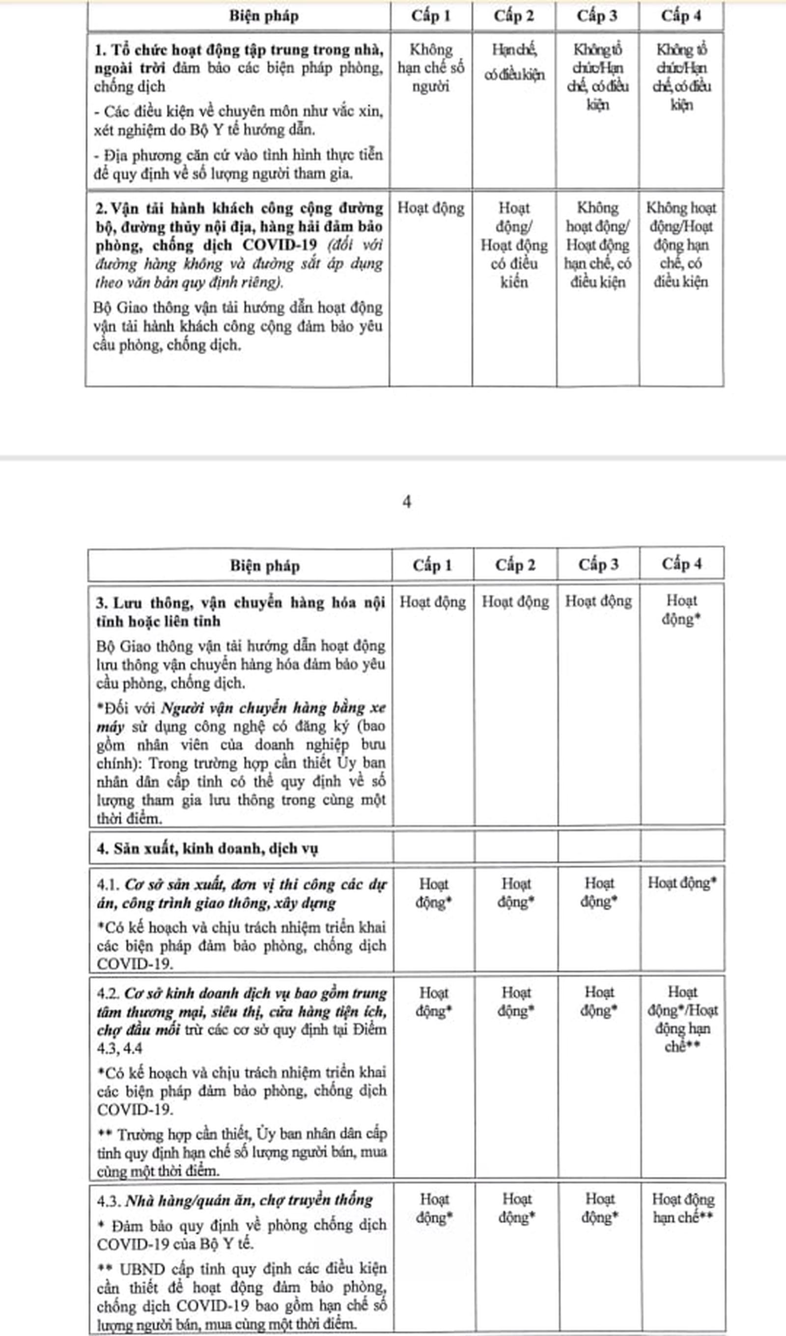 Với cơ sở sản xuất kinh doanh, doanh nghiệp, hợp tác xã, hộ gia đình, công trình giao thông, xây dựng... đều được hoạt động ở cả 4 cấp độ dịch, song phải có kế hoạch và chịu trách nhiệm triển khai các biện pháp phòng, chống dịch.