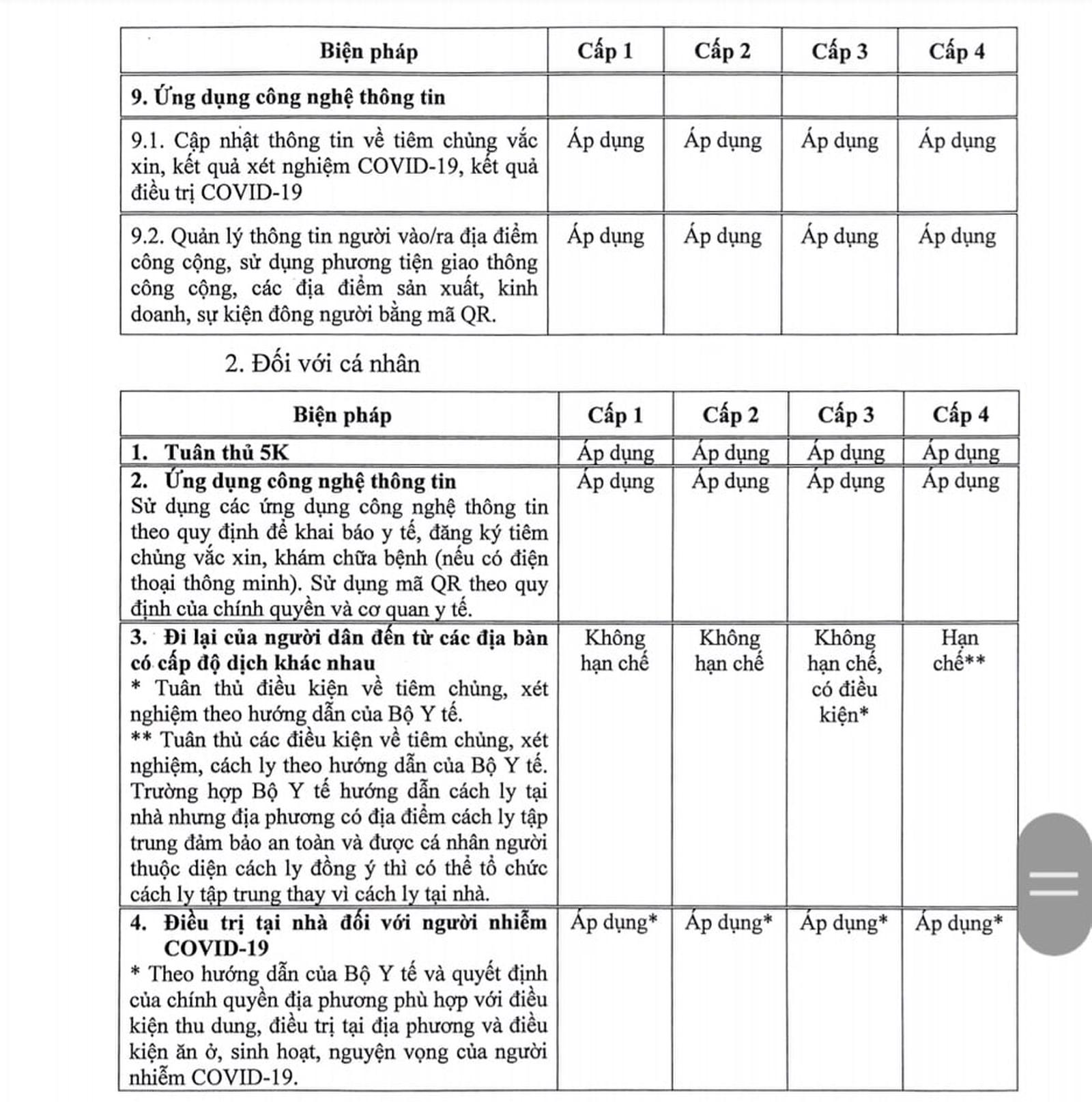 Căn cứ vào các hướng dẫn của Bộ Y tế và các bộ, ngành, UBND các tỉnh, TP quyết định các biện pháp hành chính phù hợp bao gồm các quy định, hướng dẫn cụ thể về công suất, số lượng người tham gia các hoạt động sản xuất, kinh doanh, dịch vụ, văn hóa, văn nghệ, sự kiện tập trung đông người... và có thể linh hoạt áp dụng các biện pháp bổ sung cụ thể nhưng không trái với quy định của Trung ương, không gây ách tắc lưu thông hàng hóa, sản xuất kinh doanh và đi lại, sinh hoạt của nhân dân.