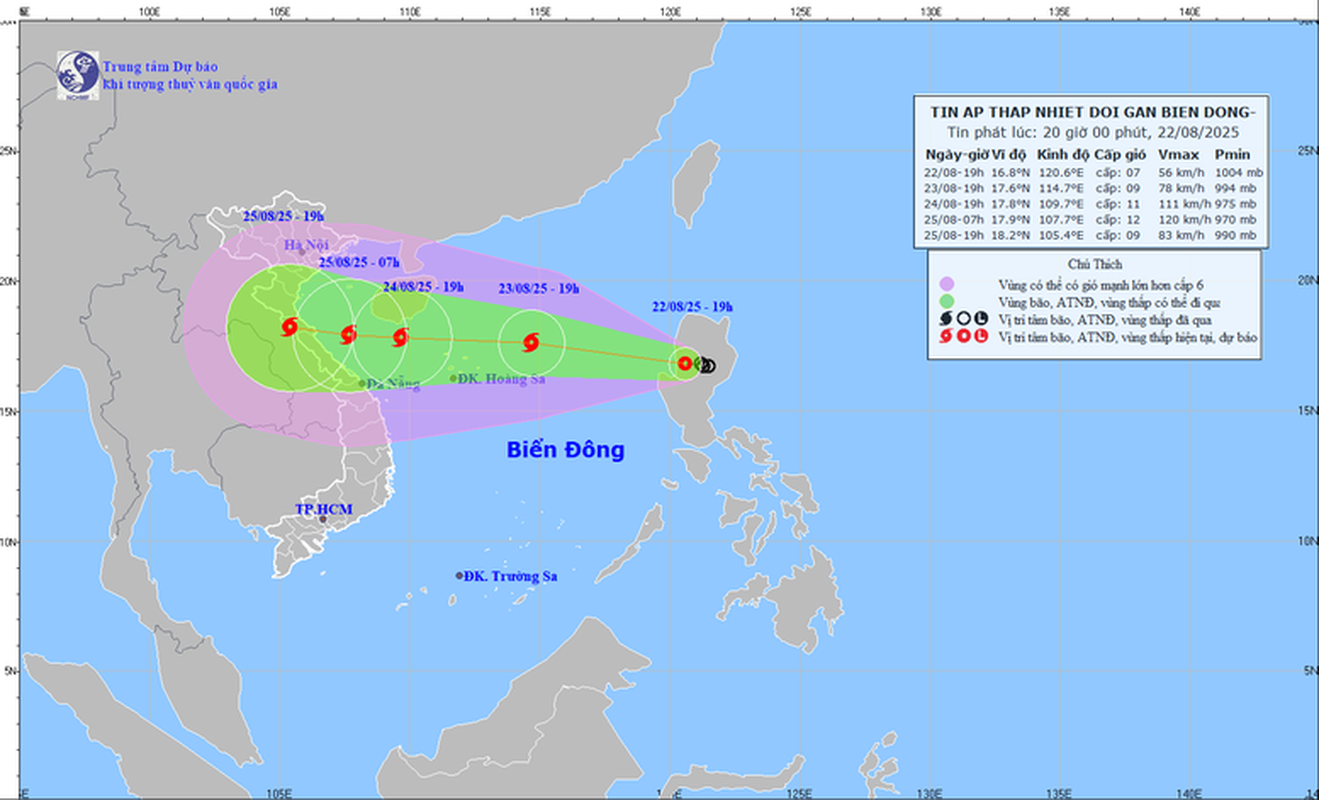 Theo dự báo của Trung tâm Dự báo khí tượng thủy văn quốc gia, đêm nay, áp thấp nhiệt đới sẽ di chuyển vào biển Đông và nhiều khả năng sẽ mạnh lên thành bão số 5; sau khi vào biển Đông, bão số 5 di chuyển nhanh với tốc độ khoảng 20 km/giờ, ngày 24/8 khi di chuyển tới khu vực quần đảo Hoàng Sa, cường độ có thể đạt cấp 10-11, giật cấp 13-14 và còn có thể mạnh thêm; ngày 25/8, bão sẽ di chuyển vào đất liền khu vực Trung Bộ nước ta.