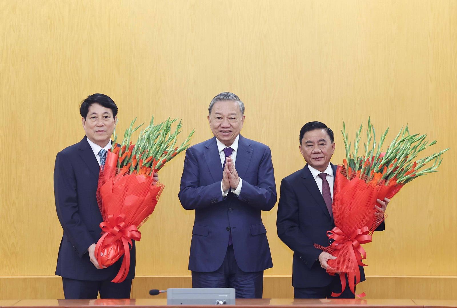 Tổng Bí thư Tô Lâm tặng hoa chúc mừng Chủ tịch nước Lương Cường và tân Thường trực Ban Bí thư Trần Cẩm Tú. Ảnh: TTXVN