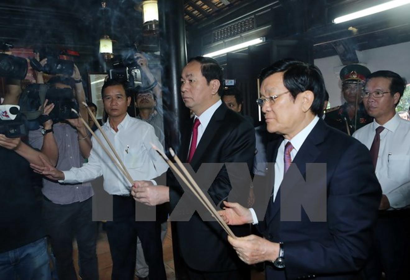 Chủ tịch nước Trần Đại Quang và nguyên Chủ tịch nước Trương Tấn Sang dâng hương tưởng niệm tại Nhà lưu niệm Quyền Chủ tịch nước Huỳnh Thúc Kháng. (Ảnh: Nhan Sáng/TTXVN)