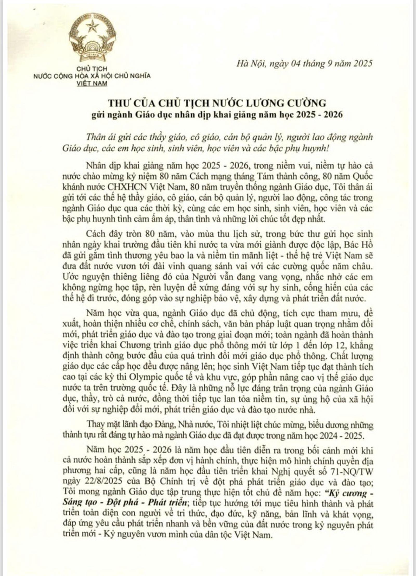 Nhân dịp khai giảng năm học 2025 – 2026, trong niềm vui, niềm tự hào cả nước chào mừng kỷ niệm 80 năm Cách mạng Tháng Tám thành công, 80 năm Quốc khánh nước CHXHCN Việt Nam, 80 năm truyền thống ngành Giáo dục, Tôi thân ái gửi tới các thế hệ thầy giáo, cô giáo, cán bộ quản lý, người lao động công tác trong ngành Giáo dục qua các thời kỳ, cùng các em học sinh, sinh viên, học viên và các bậc phụ huynh tình cảm ấm áp, thân tình và những lời chúc tốt đẹp nhất.