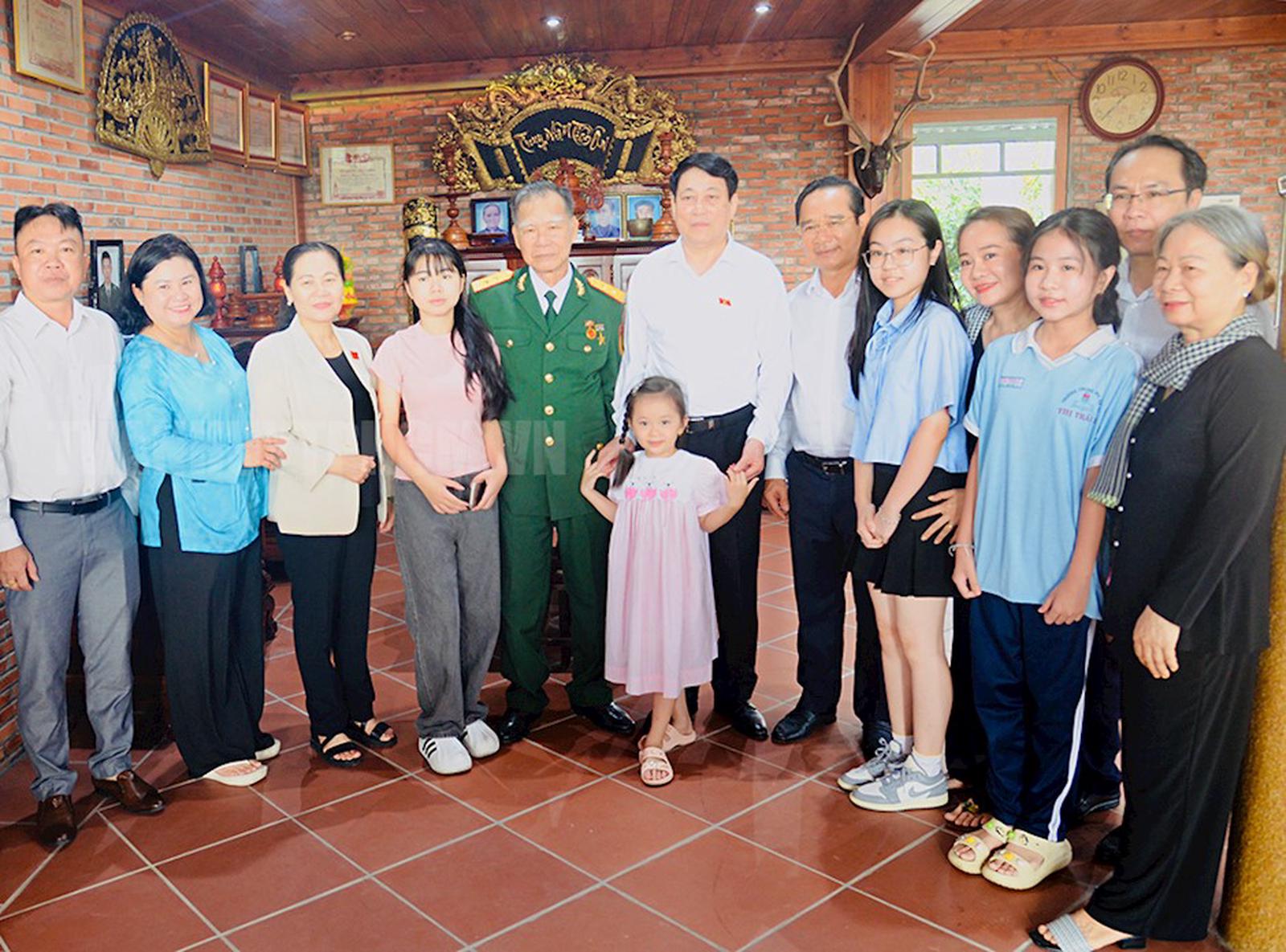 Chủ tịch nước Lương Cường cùng các đại biểu chụp ảnh lưu niệm với gia đình Anh hùng Lực lượng vũ trang Nhân dân Tô Văn Đực. Ảnh: hcmcpv.org.vn