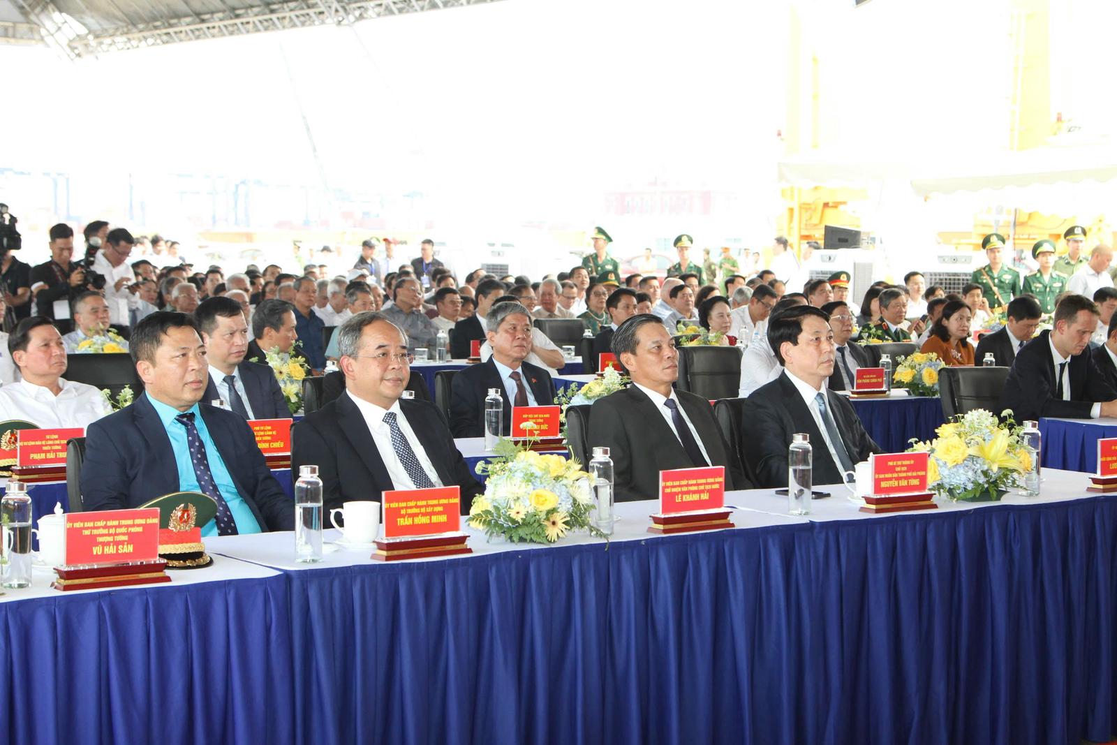 Chủ tịch nước Lương Cường cùng lãnh đạo các bộ, ngành dự lễ khánh thành bến cảng container quốc tế số 3 và 4 Lạch Huyện. Ảnh: KT