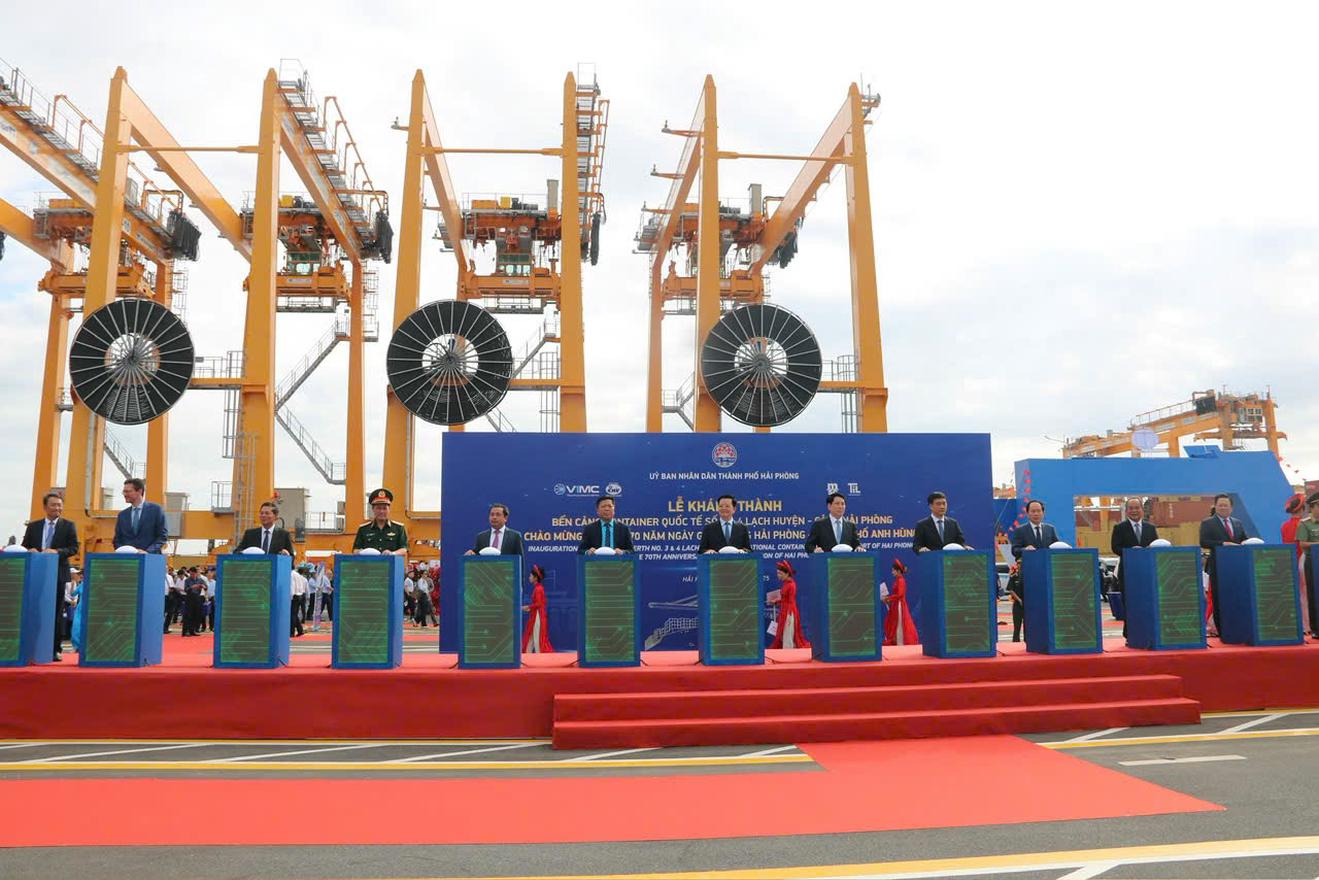 Chủ tịch nước Lương Cường cùng lãnh đạo các bộ, ngành, thành phố Hải Phòng nhấn nút lễ khánh thành bến cảng container quốc tế số 3 và 4 Lạch Huyện. Ảnh: Kim Thành