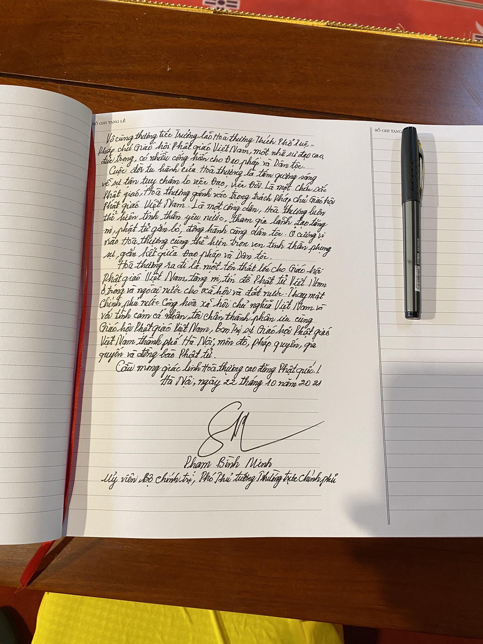 Uỷ viên Bộ Chính trị, Phó Thủ tướng Phạm Bình Minh dự lễ viếng Đức Pháp chủ và ghi vào sổ tang: “Cuộc đời tu hành của Hoà thượng là tấm gương sáng về sự tận tuỵ chăm lo việc đạo, việc đời. Là một chức sắc Phật giáo, Hoà thượng đã gánh trọng trách Pháp chủ Giáo hội Phật giáo Việt Nam. Là một công dân, Hoà thượng luôn thể hiện tinh thần yêu nước, tham gia lãnh đạo tăng ni, Phật tử gắn bó đồng hành cùng dân tộc. Ở cương vị nào, Hoà thượng cũng thể hiện trọn vẹn tinh thần phụng sự gắn kết giữa Đạo pháp và Dân tộc. Hoà thượng ra đi là một tổn thất lớn cho Giáo hội Phật giáo Việt Nam tăng, ni tín đồ Phật tử Việt Nam ở trong và ngoài nước cho xã hội và đất nước…”