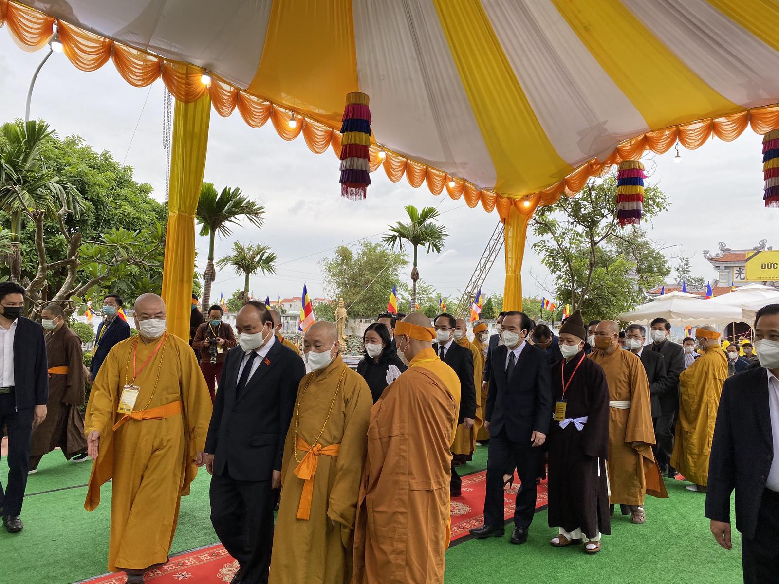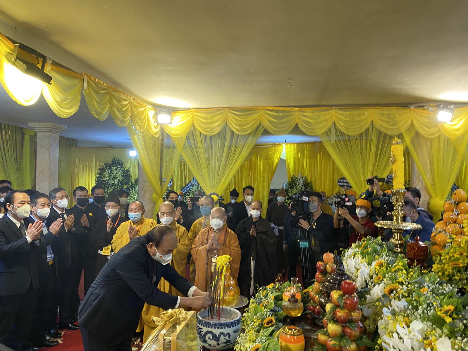 Chủ tịch nước Nguyễn Xuân Phúc kính cẩn thắp hương trước giác linh Đức Pháp chủ. Ảnh: T.V