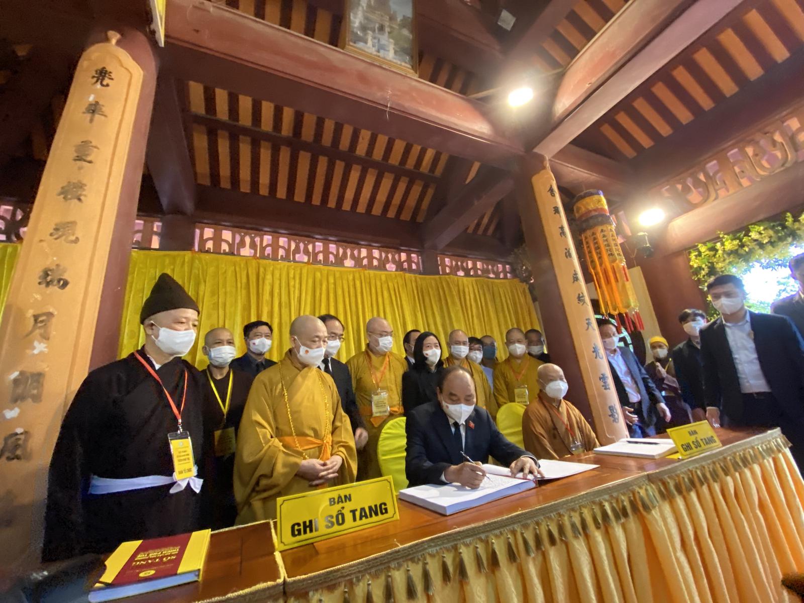 Chủ tịch nước Nguyễn Xuân Phúc ghi sổ tang tại lễ viếng Đức Pháp chủ Thích Phổ Tuệ. Ảnh: T.V