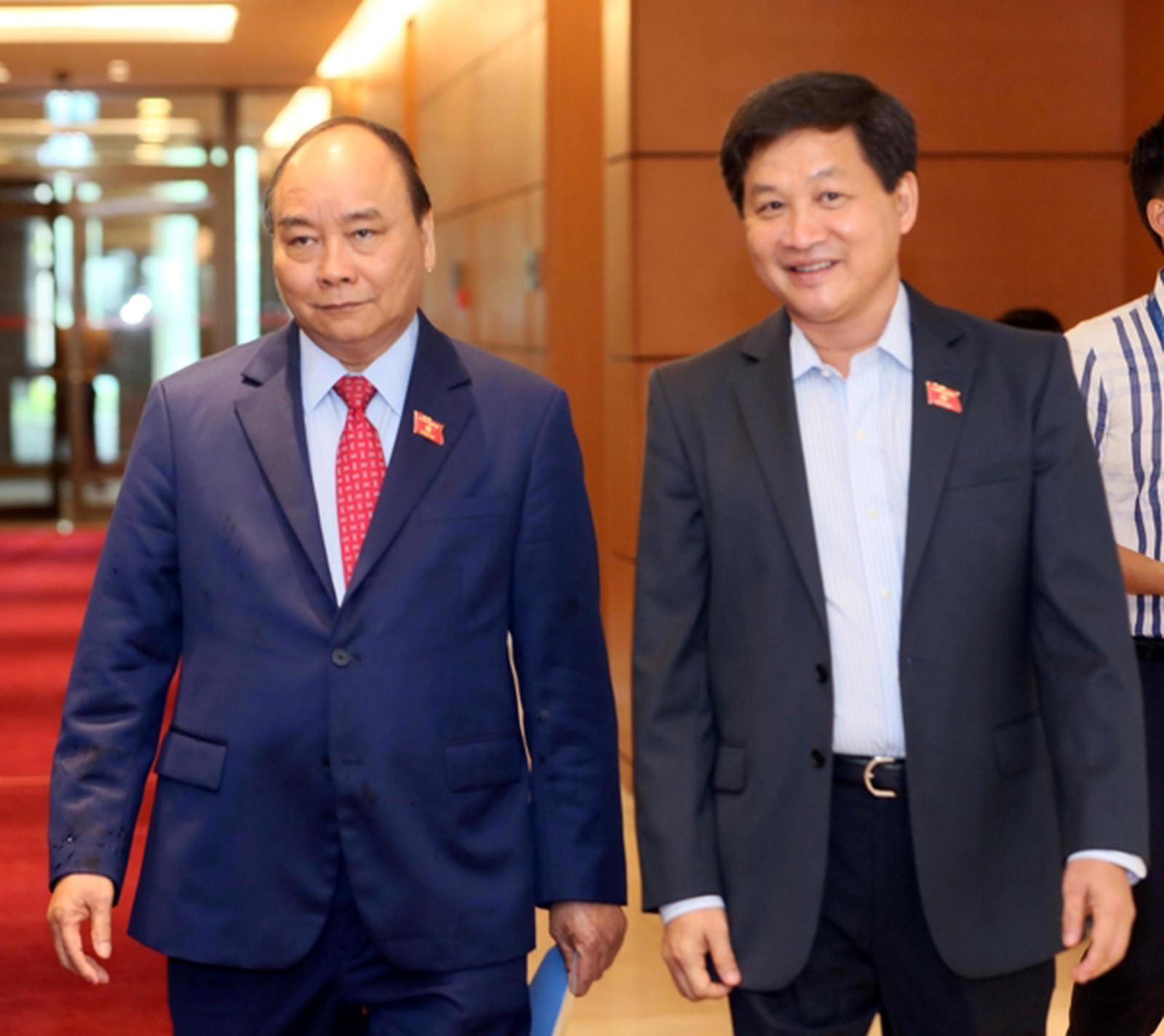 Thủ tướng Chính phủ Nguyễn Xuân Phúc và Tổng Thanh tra Chính phủ Lê Minh Khái bên hành lang QH