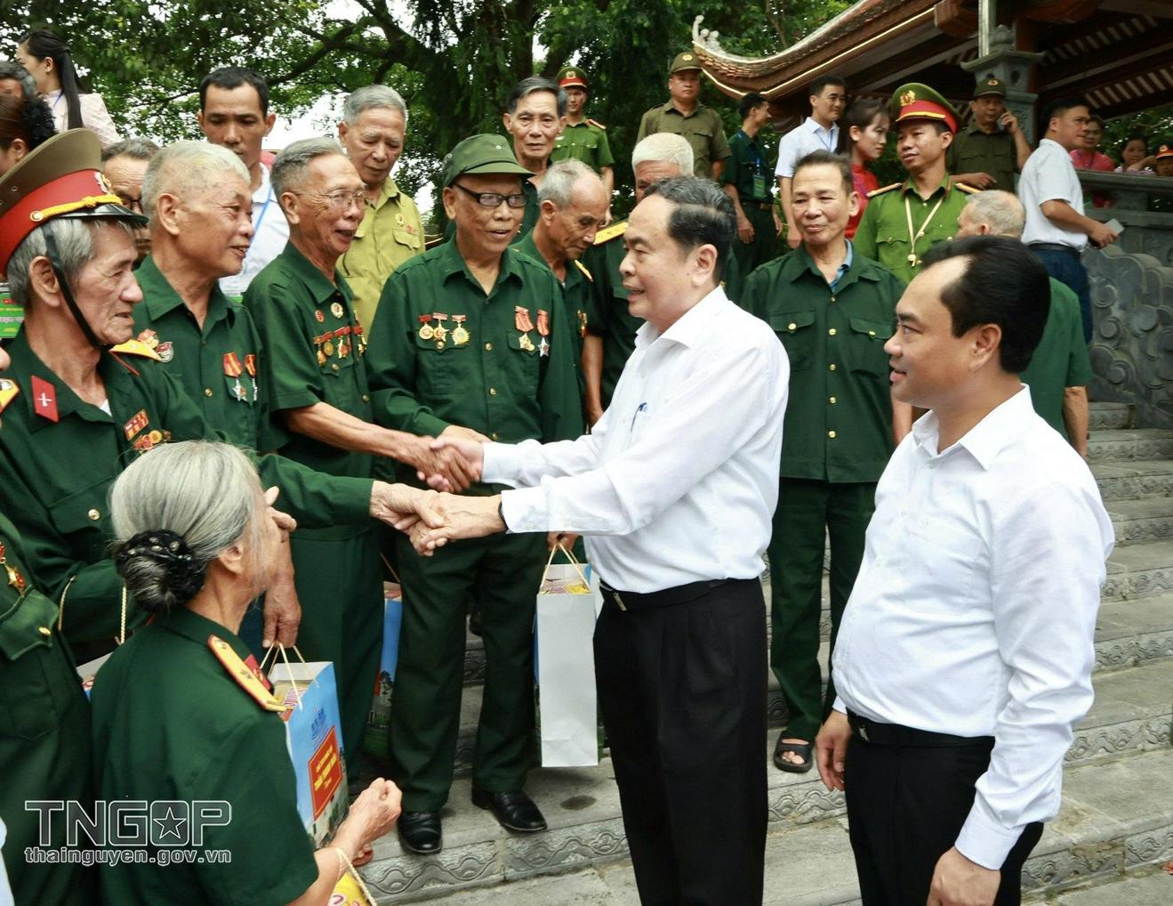 Chủ tịch Quốc hội Trần Thanh Mẫn và Bí thư Tỉnh ủy Thái Nguyên động viên người có công và thân nhân người có công với cách mạng. Ảnh: Cổng TTĐT tỉnh Thái Nguyên