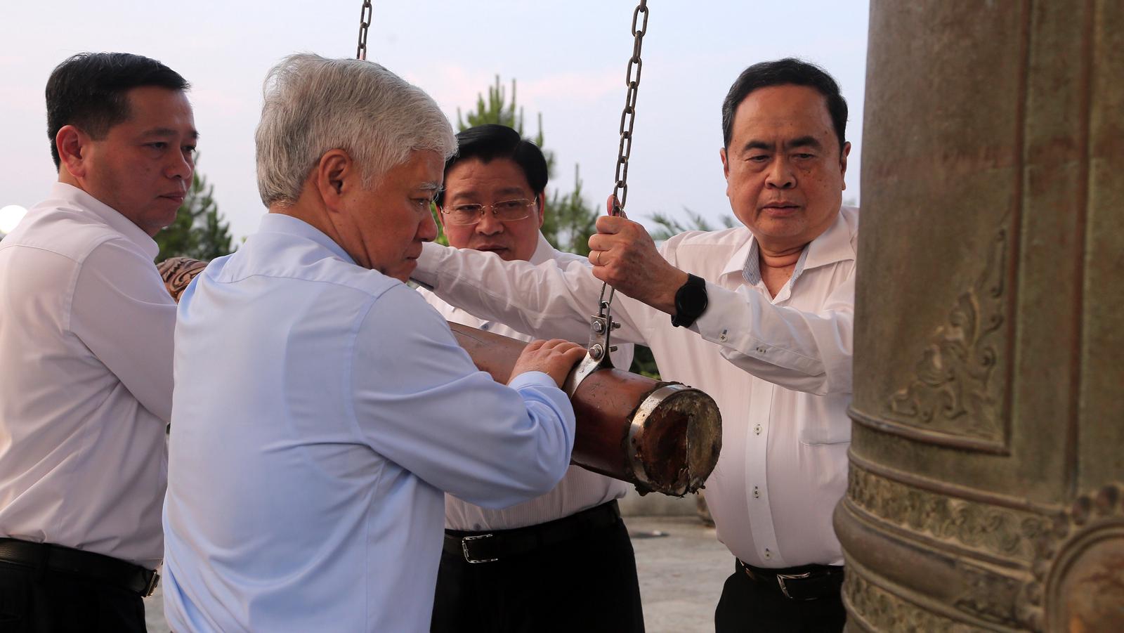 Chủ tịch Quốc hội Trần Thanh Mẫn cùng các đại biểu thỉnh chuông tại Nghĩa trang liệt sĩ Quốc gia đường 9. Ảnh: Minh Tân