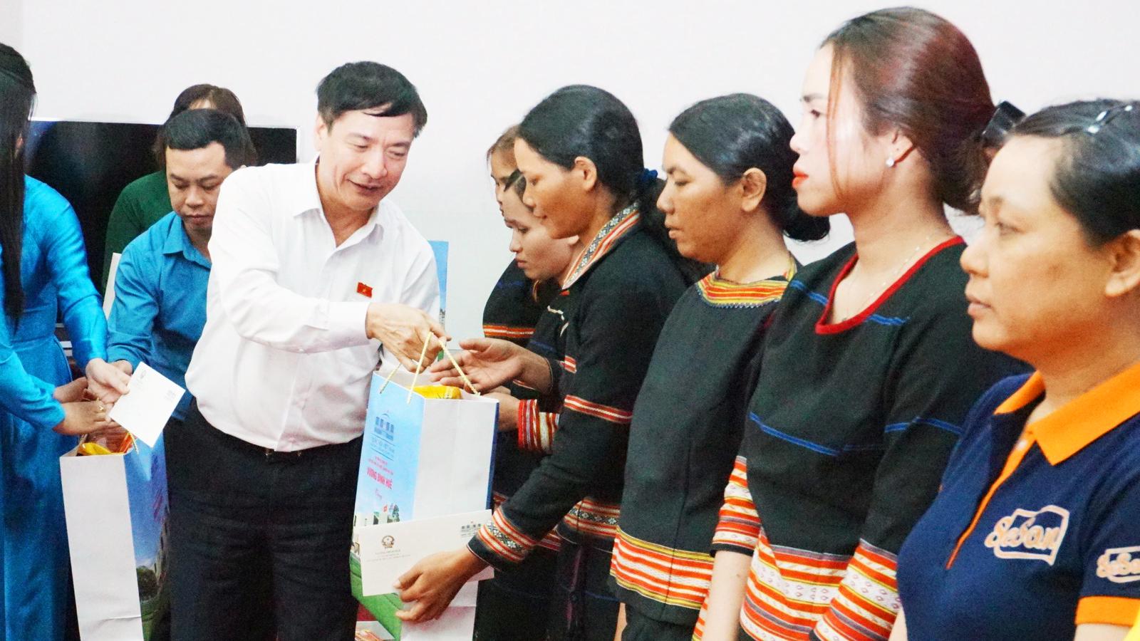 Các công nhân, người lao động là người dân tộc thiểu số nhận quà Tết do Tổng Thư ký Quốc hội, Chủ nhiệm Văn phòng Quốc hội Bùi Văn Cường trao tặng. Ảnh: T.T