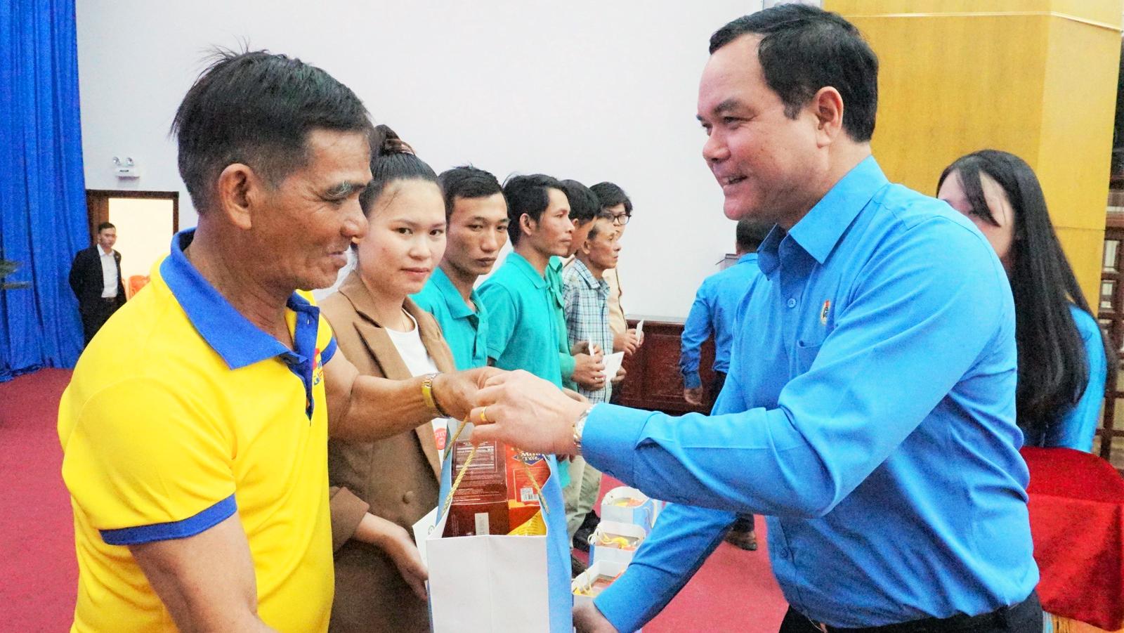 Chủ tịch Tổng LĐLĐ Việt Nam Nguyễn Đình Khang trao các phần quà Xuân đến các công nhân, người lao động có hoàn cảnh khó khăn trên địa bàn tỉnh. Ảnh: T.T