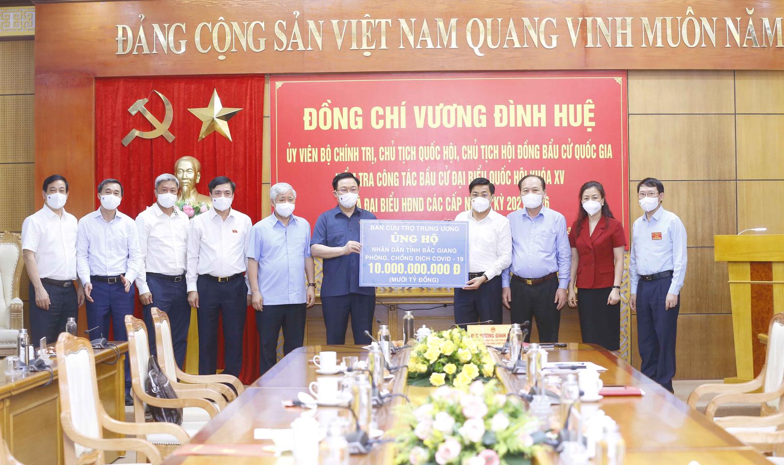 Thay mặt lãnh đạo Đảng, Nhà nước, Chủ tịch Quốc hội trao 10 tỷ đồng, 20 máy thở và 350.000 khẩu trang để tăng cường năng lực phòng, chống dịch COVID -19 cho Bắc Giang; đồng thời đề nghị các bộ, ngành liên quan tăng cường chi viện, hỗ trợ để Bắc Giang vượt qua đợt bùng phát dịch COVID -19 lần này.