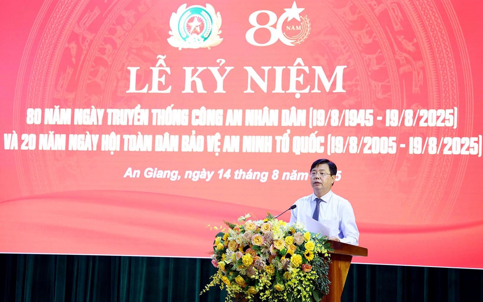 (Thanh tra) - Chiều ngày 14/8, Tỉnh ủy, HĐND, UBND, Ủy ban Mặt trận Tổ quốc Việt Nam tỉnh An Giang tổ chức Lễ kỷ niệm 80 năm Ngày Truyền thống Công an Nhân dân (19/8/1945 - 19/8/2025) và 20 năm Ngày hội toàn dân bảo vệ an ninh Tổ quốc (19/8/2005 - 19/8/2025).