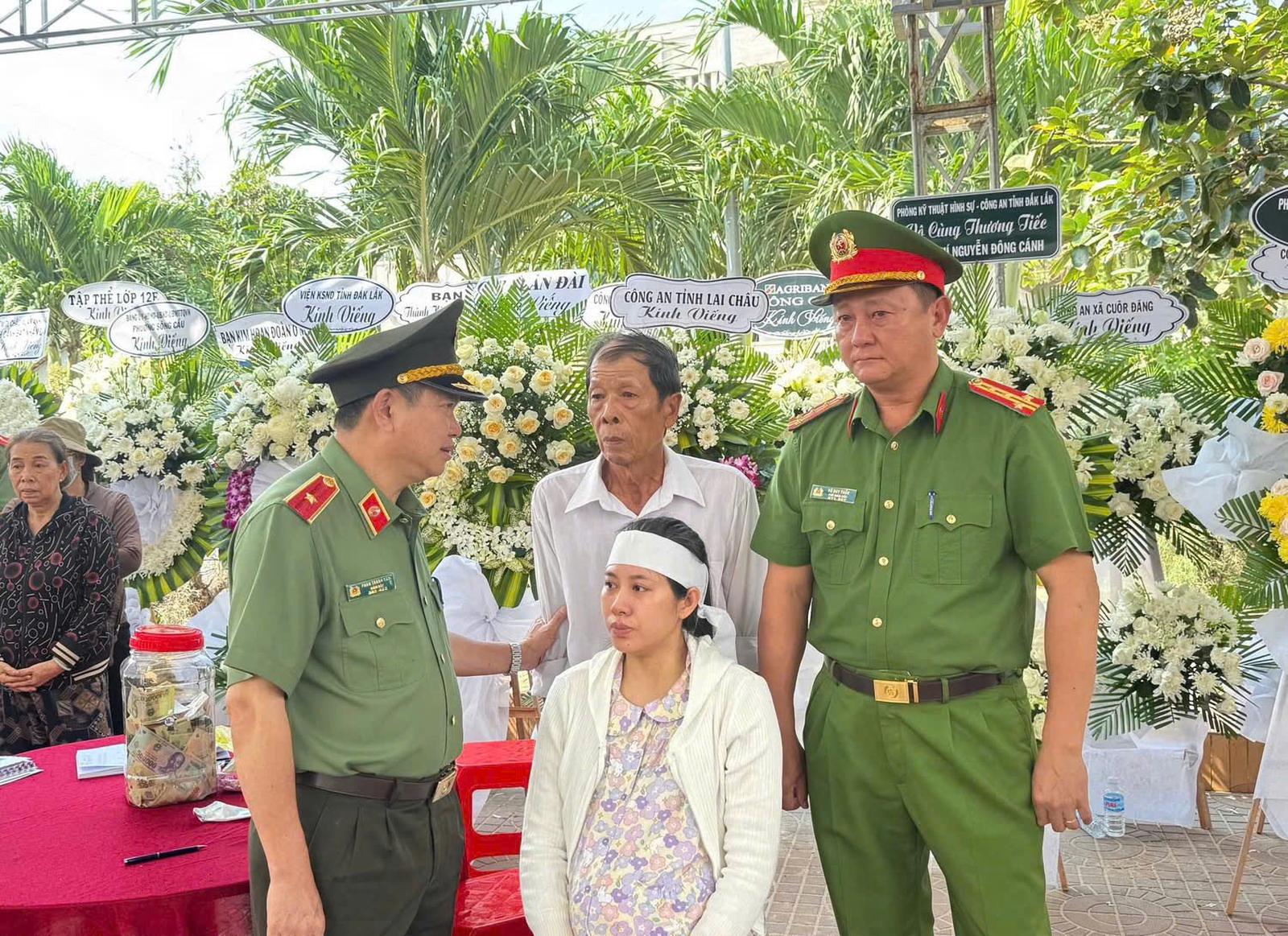 Thiếu tướng Phan Thanh Tám, Giám đốc Công an tỉnh Đắk Lắk cùng lãnh đạo Công an tỉnh thăm hỏi, động viên, chia sẻ nỗi đau với gia đình đồng chí Nguyễn Đông Cánh. Ảnh: CA
