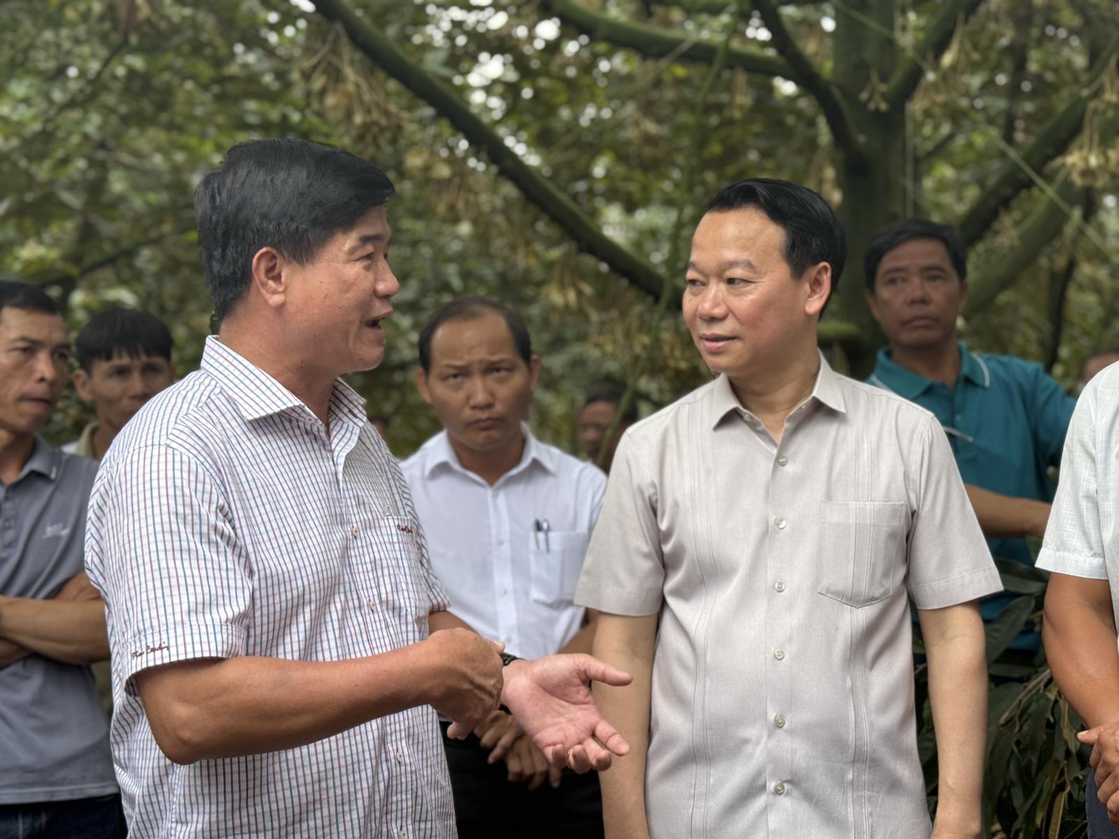 Bộ trưởng Bộ Nông nghiệp và Môi trường Đỗ Đức Duy (bìa phải) và Quyền Chủ tịch UBND tỉnh Đắk Lắk Nguyễn Thiên Văn cùng đoàn công tác đi thực địa vùng trồng sầu riêng tại huyện Krông Pắc (Đắk Lắk). Ảnh: NG
