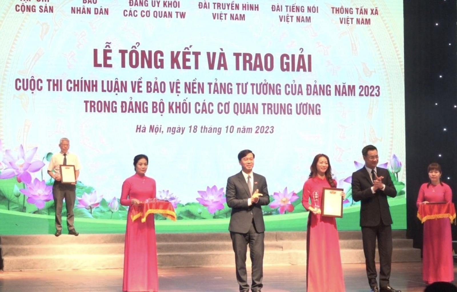Tác giả Hoàng Diệu Anh (giữa) của Báo Thanh tra thuộc Đảng bộ TTCP đã vinh dự giành Giải Khuyến khích với tác phẩm “Cơ sở khoa học bác bỏ luận điệu “Việt Nam không có tự do báo chí”". Ảnh: DA