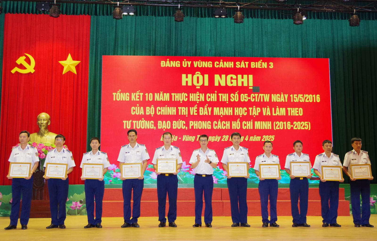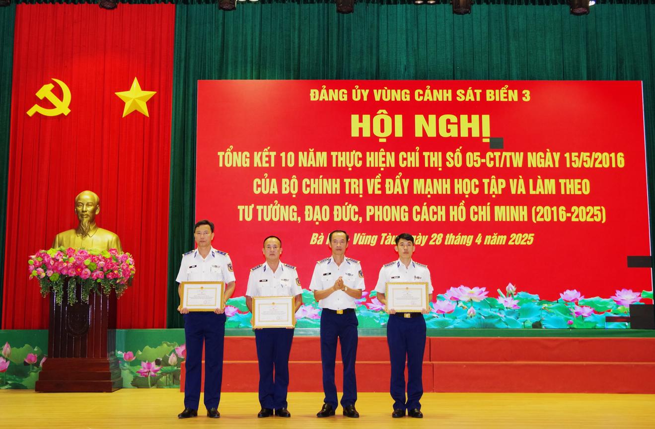 Nhân dịp này, Bộ Tư lệnh Vùng Cảnh sát biển 3 đã khen thưởng 4 tập thể, 13 cá nhân đã hoàn thành xuất sắc các nội dung trong 10 năm thực hiện Chỉ thị số 05-CT/TW của Bộ Chính trị.