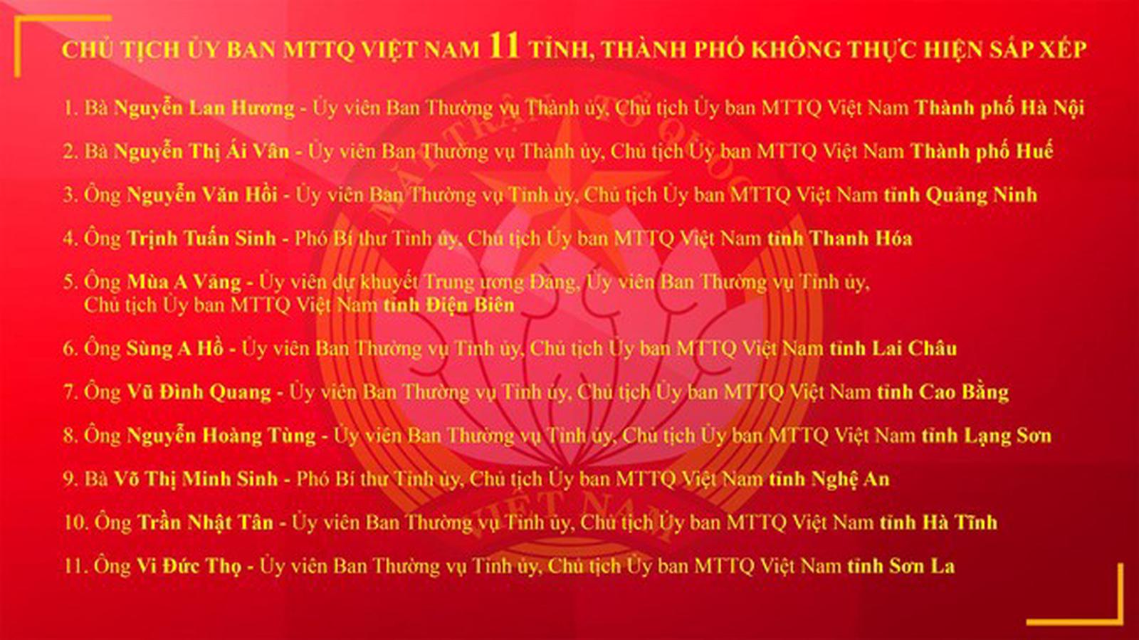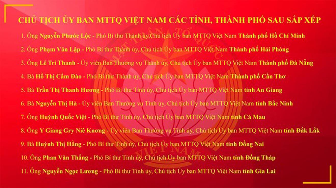 Danh sách Chủ tịch Ủy ban Mặt trận Tổ quốc MTTQ Việt Nam các tỉnh, thành phố không thực hiện sắp xếp. Ảnh: H.D