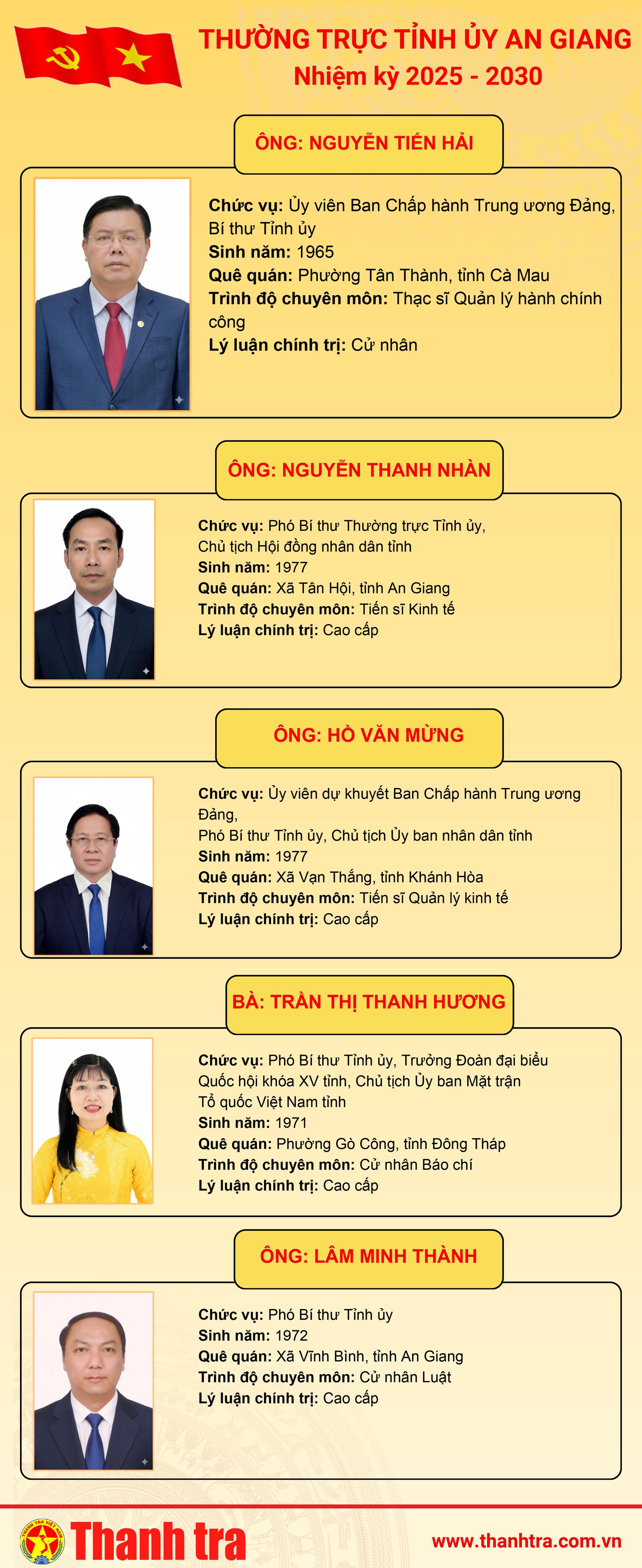 Các Phó Bí thư Tỉnh ủy: Ông Hồ Văn Mừng, Ủy viên dự khuyết Trung ương Đảng, Phó Bí thư Tỉnh ủy, Chủ tịch UBND tỉnh An Giang; bà Trần Thị Thanh Hương, Phó Bí thư Tỉnh ủy, Trưởng đoàn Đại biểu Quốc hội khóa XV tỉnh, Chủ tịch Ủy ban Mặt trận Tổ quốc Việt Nam tỉnh An Giang; ông Lâm Minh Thành, Phó Bí thư Tỉnh ủy An Giang.