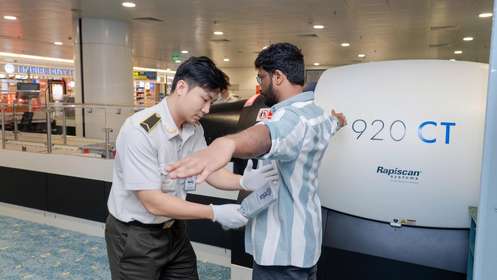 Những vị khách đầu tiên sử dụng máy soi chiếu thông minh. Ảnh: Cảng HKQT Nội Bài
