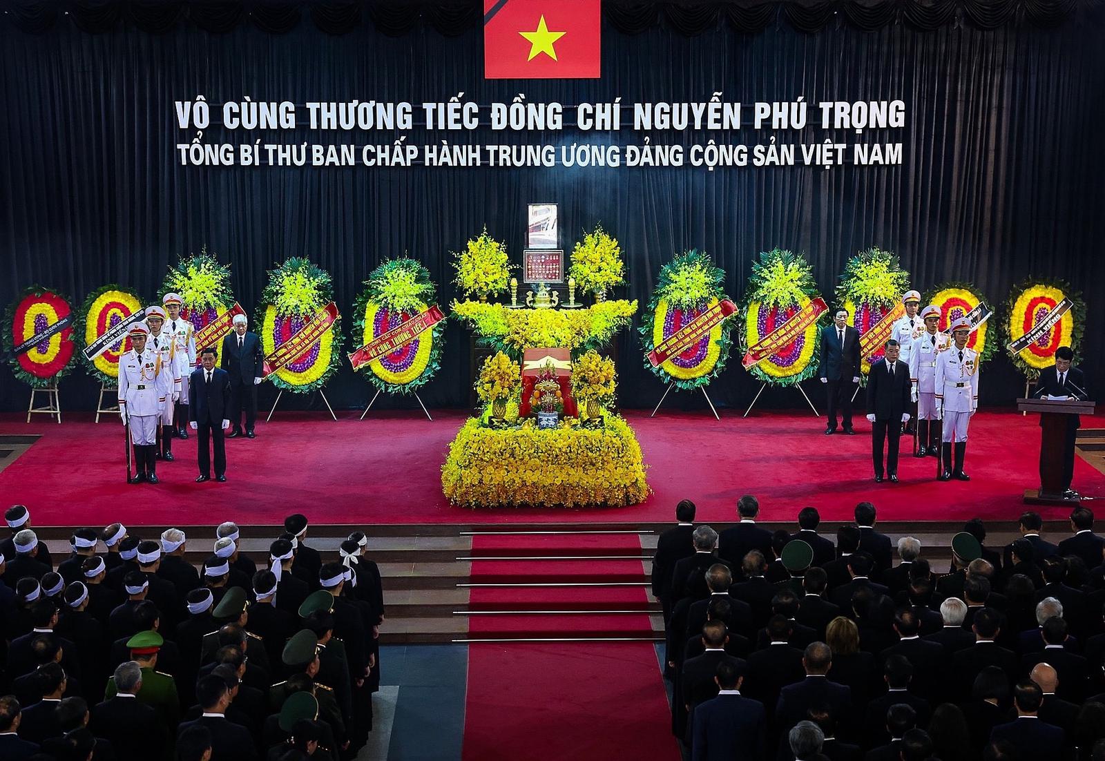 Trước anh linh Tổng Bí thư Nguyễn Phú Trọng, Chủ tịch nước nói: “Tên tuổi và sự nghiệp, công lao và cống hiến, tài năng và đức độ của đồng chí sẽ còn sáng mãi trong lịch sử vẻ vang của Đảng ta, dân tộc ta, trong sự tri ân của cán bộ, đảng viên và Nhân dân ta, trong tình cảm của bạn bè quốc tế”.