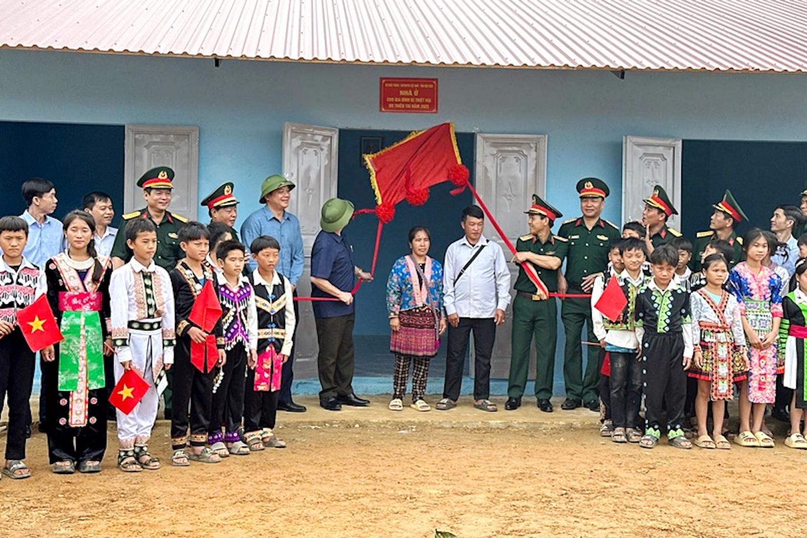 Lãnh đạo Quân khu 2 và lãnh đạo tỉnh Điện Biên khánh thành nhà mới cho người dân vùng lũ. Ảnh: Tuyết Anh