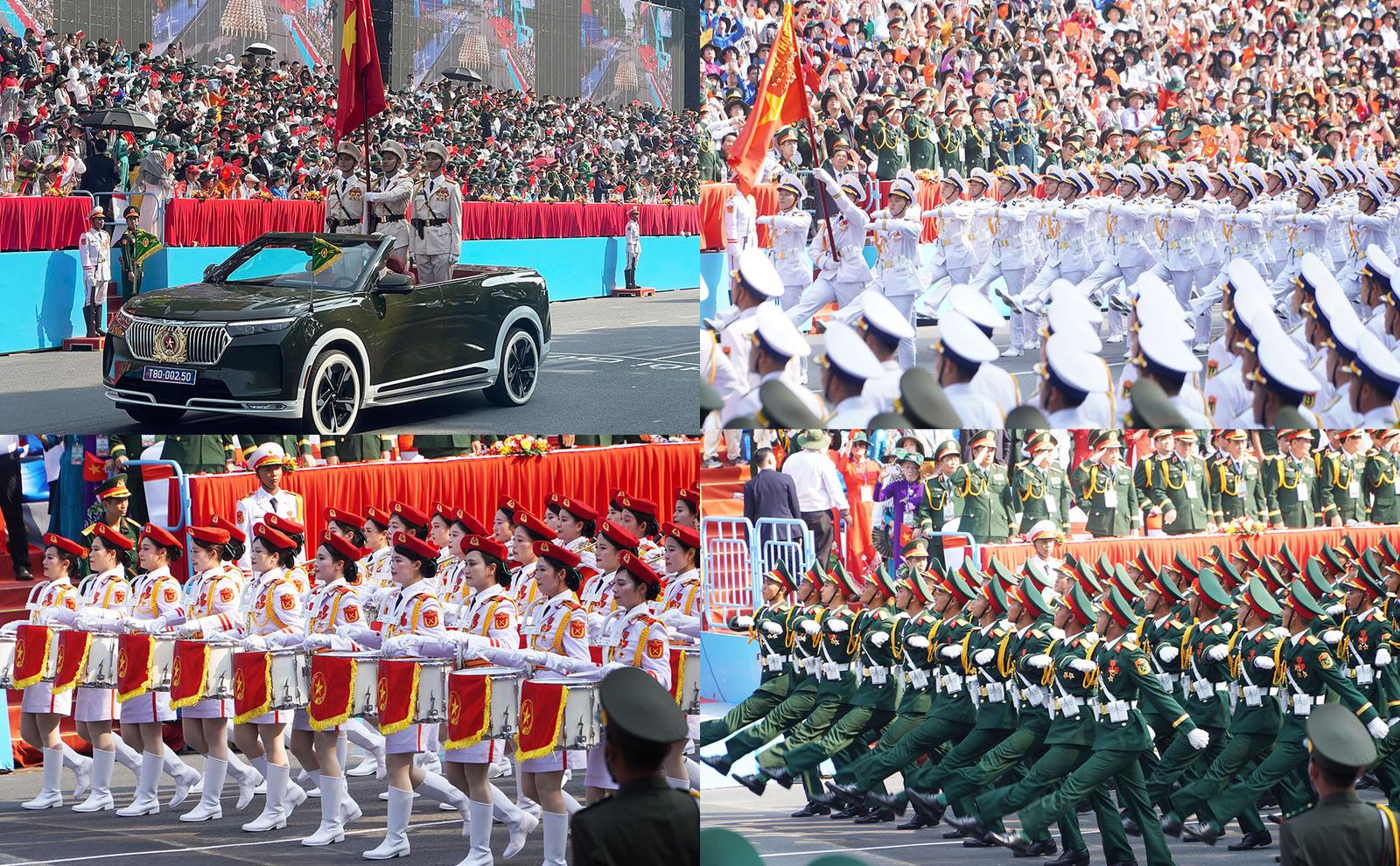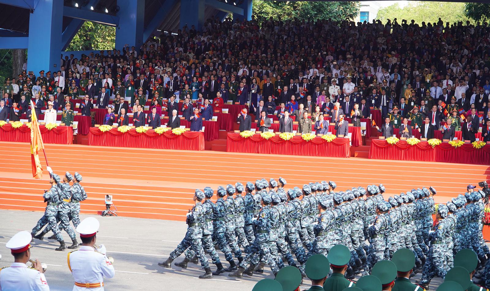 Chương trình diễu binh, diễu hành gồm phần trình diễn của máy bay trực thăng và tiêm kích chiến đấu; diễu binh của 4 khối nghi trượng, 36 khối của quân đội và công an, 12 khối diễu hành và khối diễu binh của quân đội Trung Quốc, Lào và Campuchia.