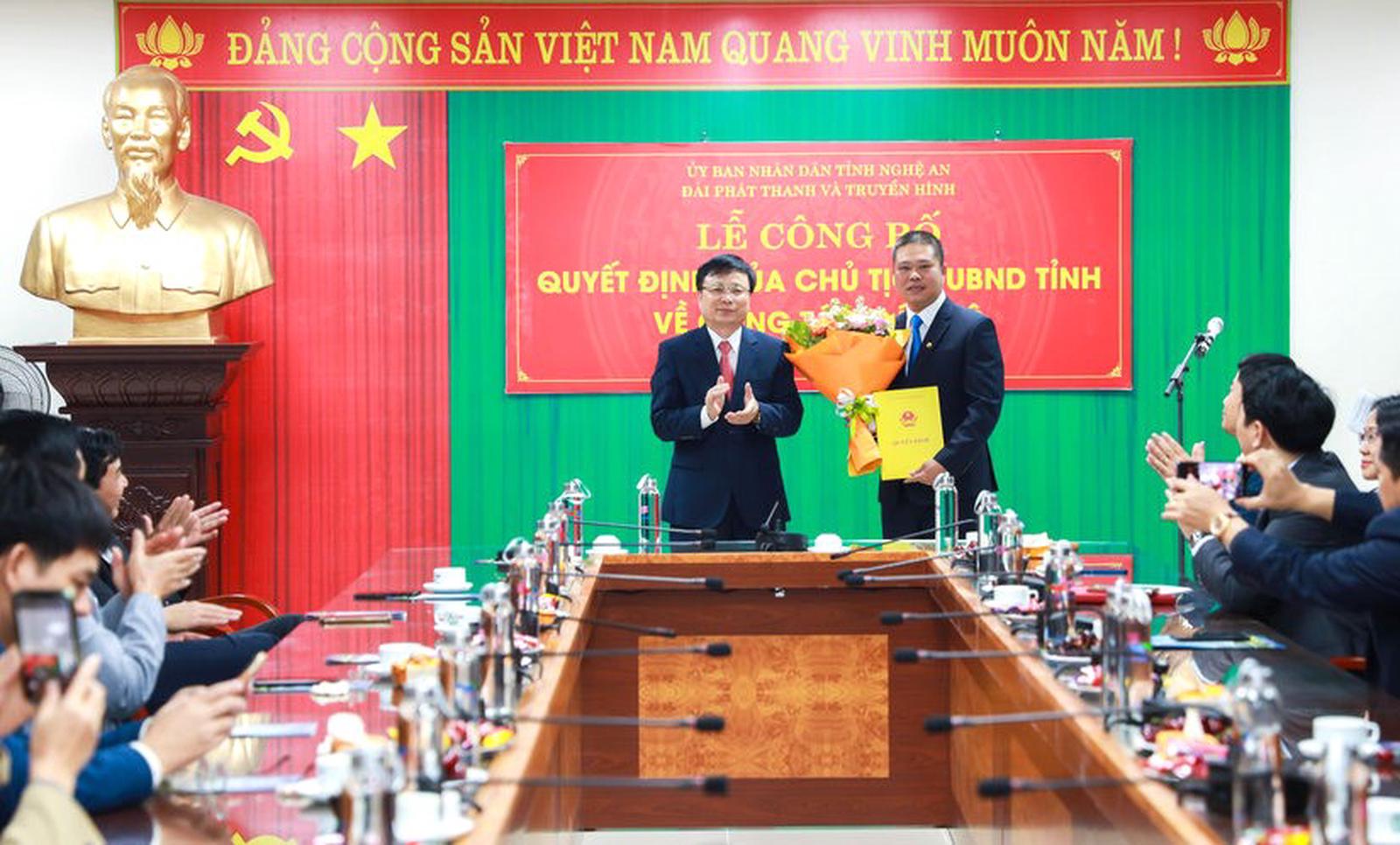 Ông Bùi Đình Long - Phó Chủ tịch UBND tỉnh tặng hoa chúc mừng tân Phó Giám đốc Đài PTTH Nghệ An Nguyễn Trung Thảo. Ảnh: NTV