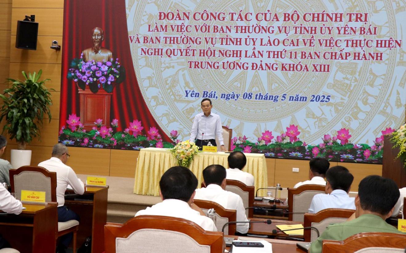(Thanh tra) - Sáng 8/5, tại tỉnh Yên Bái, Đoàn công tác của Bộ Chính trị do ông Trần Lưu Quang, Bí thư Trung ương Đảng, Trưởng Ban Chính sách, chiến lược Trung ương làm Trưởng đoàn đã có buổi làm việc với Ban Thường vụ Tỉnh ủy hai tỉnh Yên Bái và Lào Cai về việc tổ chức, chỉ đạo và triển khai thực hiện Nghị quyết Hội nghị lần thứ 11, Ban Chấp hành Trung ương Đảng khóa XIII.
