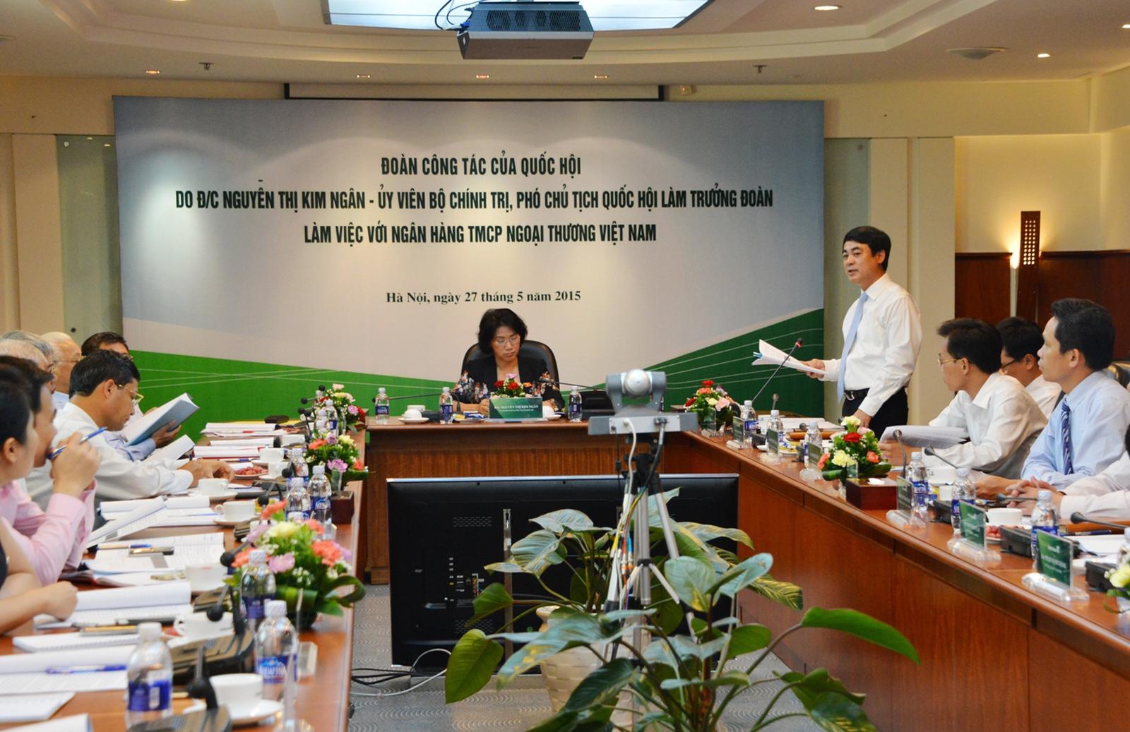 Ngày 27/5/2015, tại Hà Nội, đoàn công tác của Quốc hội đã có buổi làm việc với Ngân hàng TMCP Ngoại thương Việt Nam (Vietcombank) về tình hình thực hiện tái cơ cấu của Vietcombank. Thành phần đoàn công tác của Quốc hội gồm có: đồng chí (đ/c) Nguyễn Thị Kim Ngân - Ủy viên Bộ Chính trị, Phó Chủ tịch Quốc hội - Trưởng đoàn công tác; đ/c Nguyễn Văn Giàu - Ủy viên BCH TW Đảng, Ủy viên UBTV Quốc hội, Chủ nhiệm Ủy ban Kinh tế; đ/c Nguyễn Đức Kiên - Phó Chủ nhiệm Ủy ban Kinh tế; đ/c Trần Văn - Phó Chủ nhiệm Ủy ban Tài chính Ngân sách; đ/c Vũ Viết Ngoạn - Ủy viên Ủy ban Kinh tế - Chủ tịch Ủy ban Giám sát Tài chính Quốc gia; đ/c Cao Sỹ Kiêm - Ủy viên Ủy ban Kinh tế.