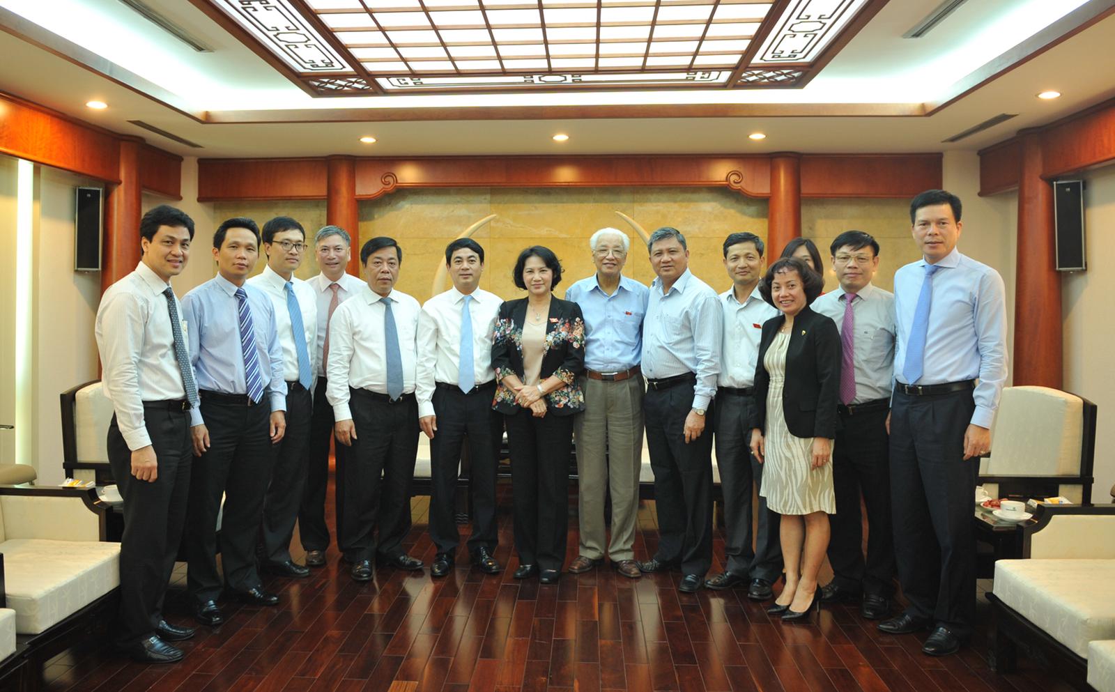 Đ/c Nguyễn Thị Kim Ngân - Ủy viên Bộ Chính trị, Phó Chủ tịch Quốc hội (thứ 7 từ trái sang) và các đ/c trong đoàn công tác chụp hình lưu niệm với lãnh đạo NHNN và Vietcombank