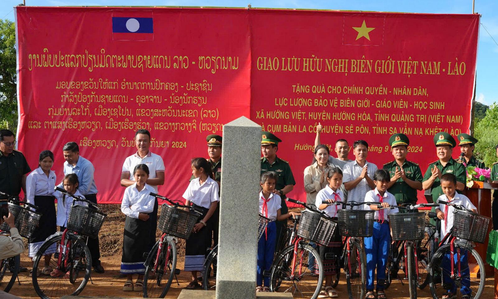 Báo Thanh tra phối hợp cùng Đồn Biên phòng Hướng Lập tặng quà cho học sinh xã Hướng Việt và cụm bản La Cồ, huyện Sê Pôn, tỉnh Savannakhet, Lào. Ảnh: Minh Tân