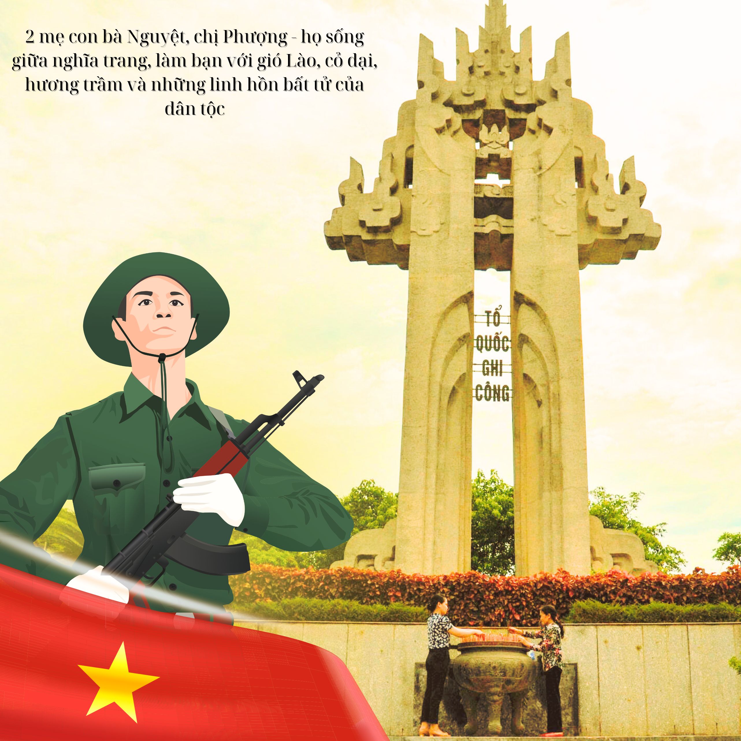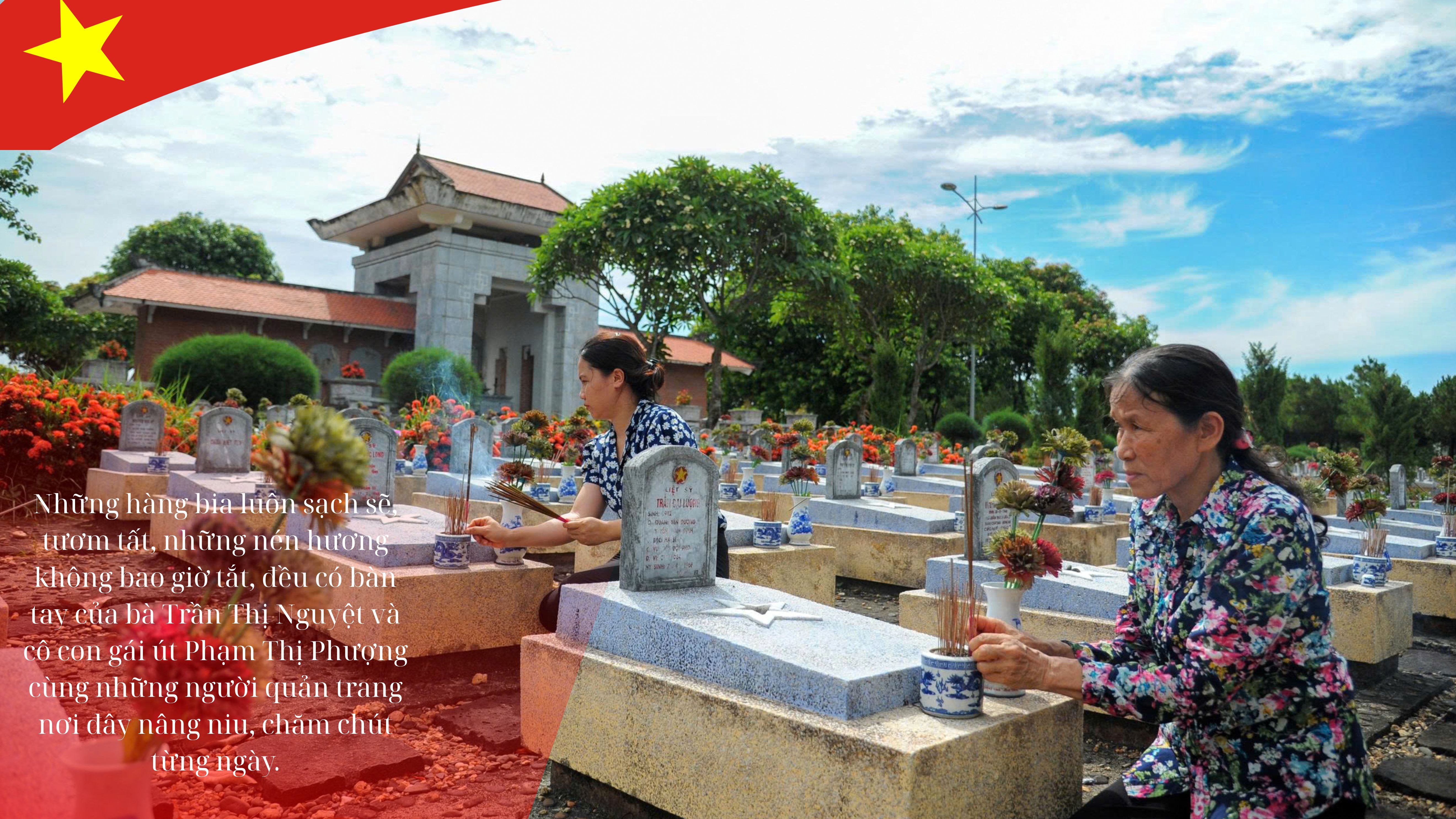 Ở huyện Vĩnh Linh (nay là xã Vĩnh Linh, tỉnh Quảng Trị), nghĩa trang liệt sĩ cấp huyện lớn nhất tỉnh nằm yên bình trên một đồi cao rộng 6 ha – nơi quy tụ hơn 5.600 liệt sĩ của 41 tỉnh thành trong cả nước. Những hàng bia luôn sạch sẽ, tươm tất, những nén hương không bao giờ tắt, đều có bàn tay của bà Trần Thị Nguyệt và cô con gái út Phạm Thị Phượng cùng những người quản trang nơi đây nâng niu, chăm chút từng ngày.
