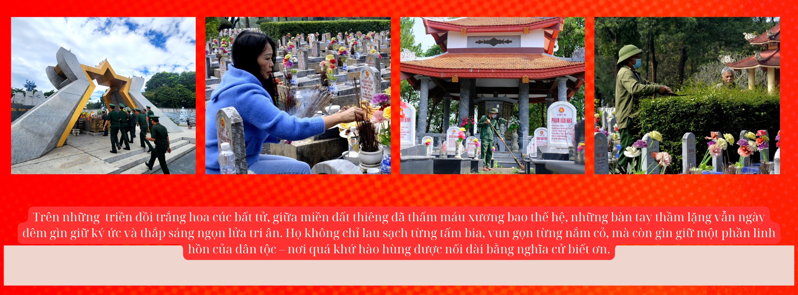 Giữa những triền đồi trắng hoa cúc bất tử, nơi hương trầm bảng lảng quyện trong nắng sớm, bước chân của những người quản trang vẫn âm thầm vang lên mỗi ngày, bền bỉ như nhịp tim tri ân không bao giờ tắt. Họ nhẫn nại dọn cỏ, vun từng gốc cây, nâng niu từng cành hoa, thắp từng nén nhang bằng tất cả sự kính cẩn. Nhờ đôi tay lặng thầm ấy, mỗi lần thân nhân, đồng đội từ khắp mọi miền trở về đều nghẹn ngào mà nhẹ lòng vì biết rằng nơi yên nghỉ của những người nằm lại luôn được gìn giữ, chăm sóc bằng tất cả tấm lòng son sắt.