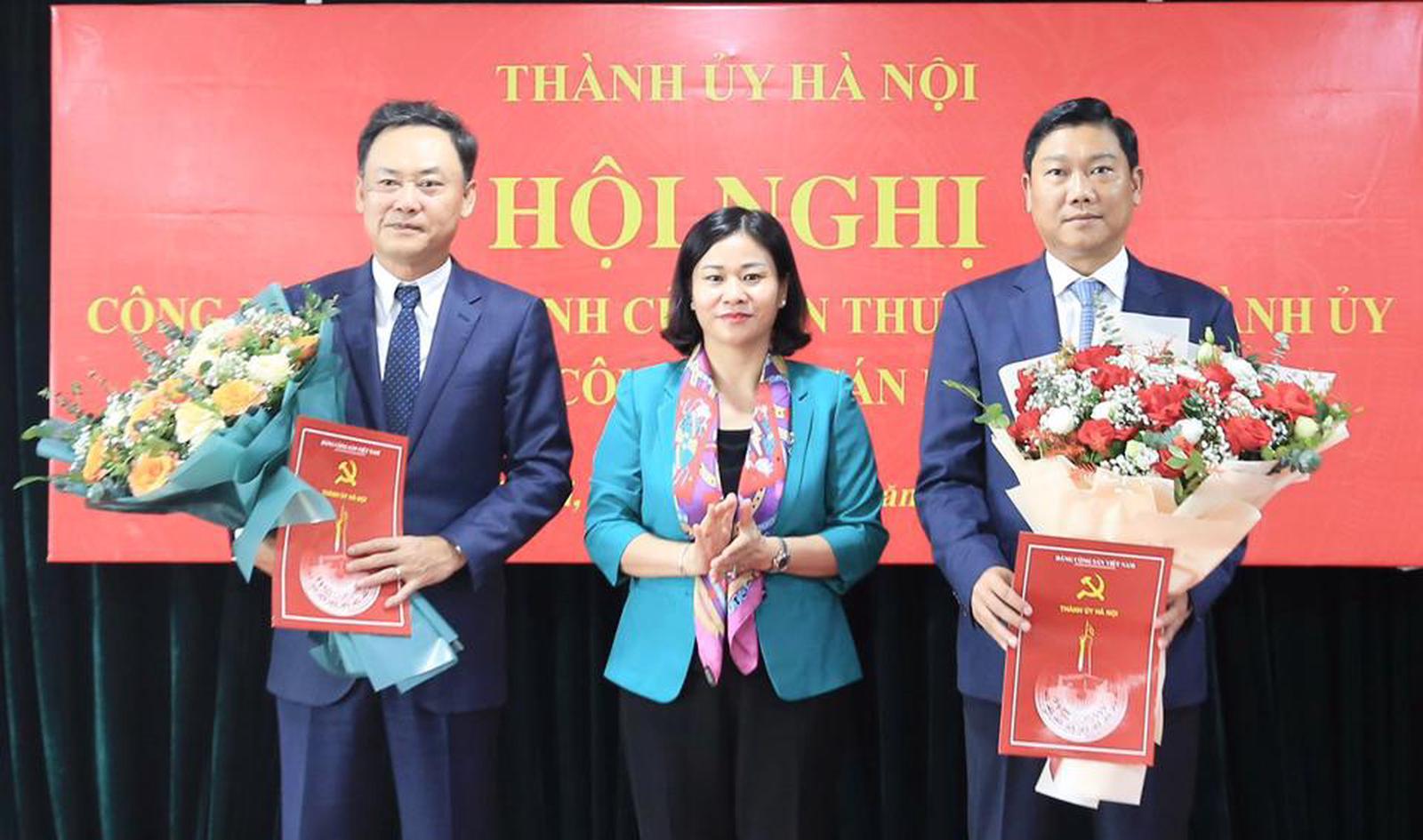 Phó Bí thư Thường trực Thành ủy Nguyễn Thị Tuyến trao quyết định cho đồng chí Bùi Huyền Mai và Nguyễn Việt Hà. Ảnh: P.H