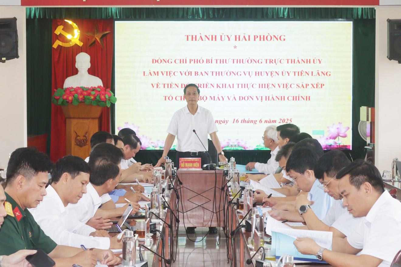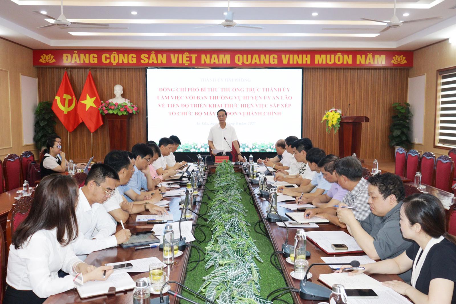 Phát biểu tại buổi làm việc, Phó Bí thư Thường trực Thành ủy Đỗ Mạnh Hiến ghi nhận, đánh giá cao tinh thần chủ động, nghiêm túc của Ban Thường vụ Huyện ủy An Lão và Tiên Lãng trong triển khai thực hiện chỉ đạo của Trung ương, Thành ủy về sắp xếp tổ chức bộ máy và đơn vị hành chính.