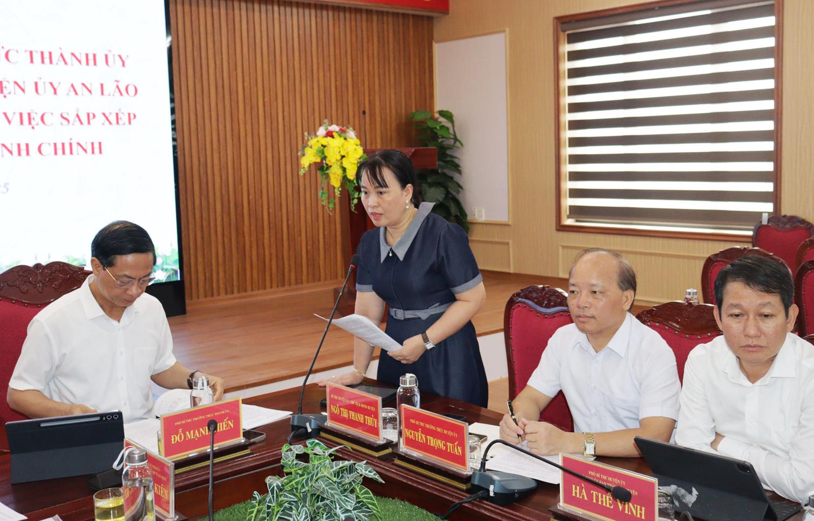 Thành ủy, đại diện lãnh đạo huyện An Lão và huyện Tiên Lãng cho biết: Công tác triển khai đảm bảo đúng nguyên tắc, nội dung đầy đủ, phù hợp với tình hình thực tế. Các địa phương đã xây dựng phương án nhân sự Ban Chấp hành, Ban Thường vụ, Ủy ban Kiểm tra cấp ủy xã mới; dự kiến phân công nhân sự đảm nhiệm các chức danh lãnh đạo, quản lý nhiệm kỳ 2025–2030 và bố trí đội ngũ cán bộ, công chức, viên chức tại các cơ quan Đảng, chính quyền, MTTQ cấp xã. Đồng thời, các huyện tập trung chỉ đạo tổ chức Đại hội chi bộ, đảng bộ cơ sở theo đúng hướng dẫn, chuẩn bị báo cáo chính trị và điều kiện cơ sở vật chất phục vụ Đại hội.